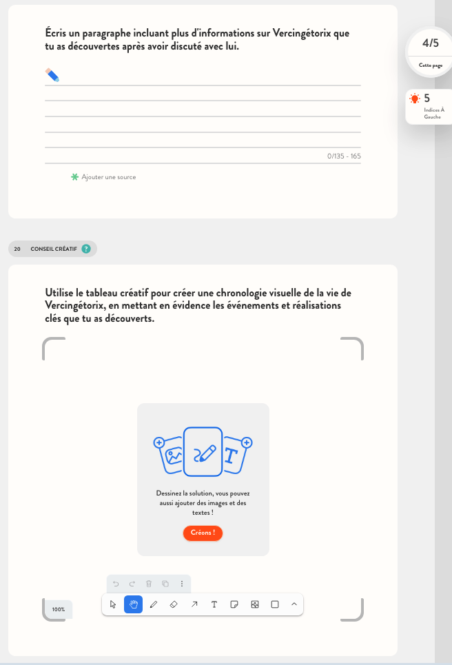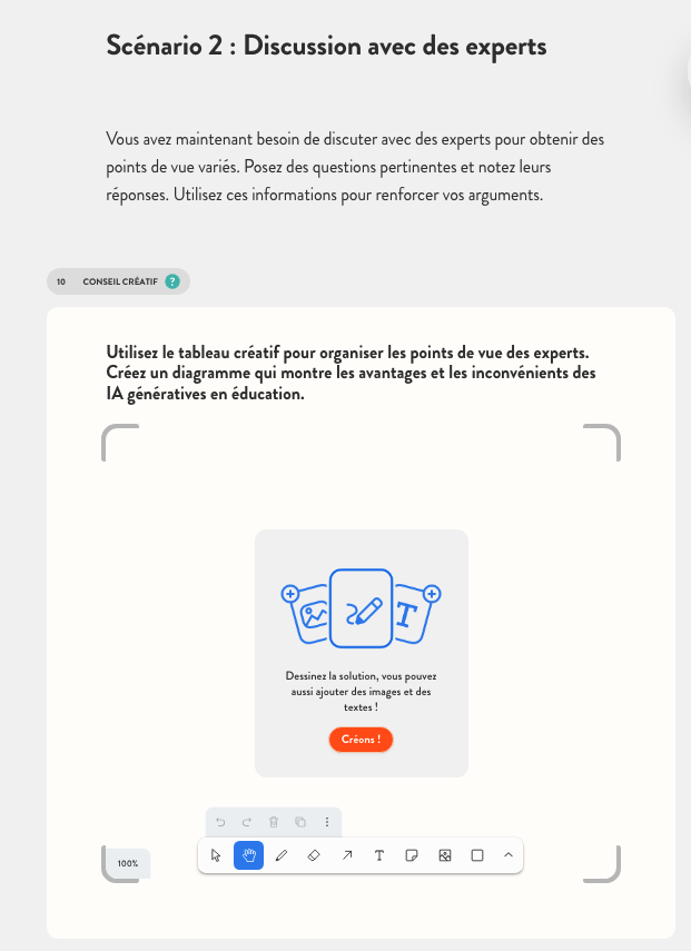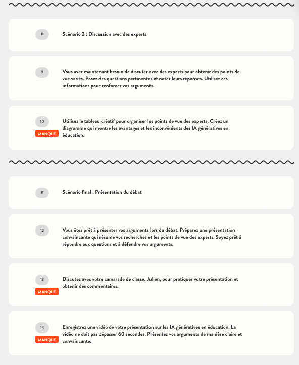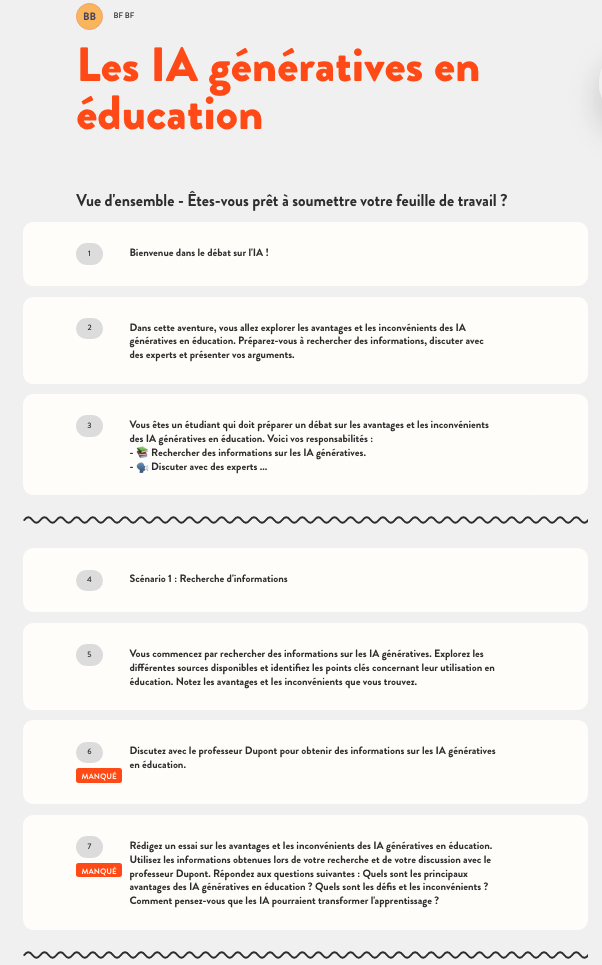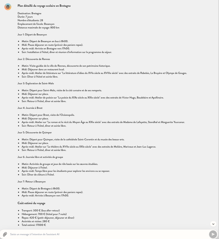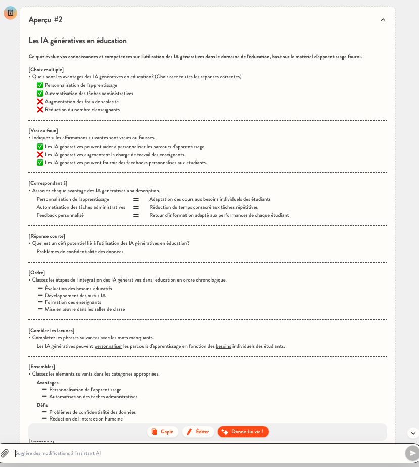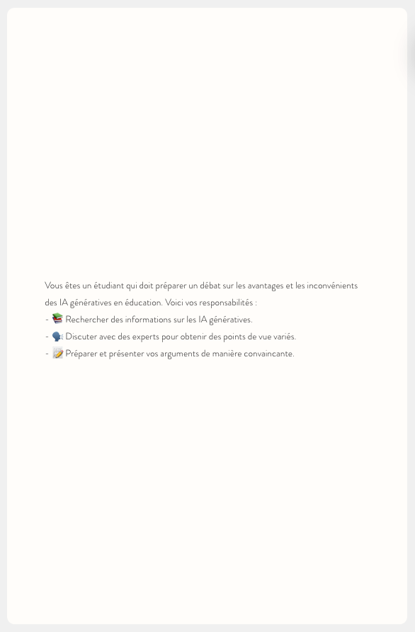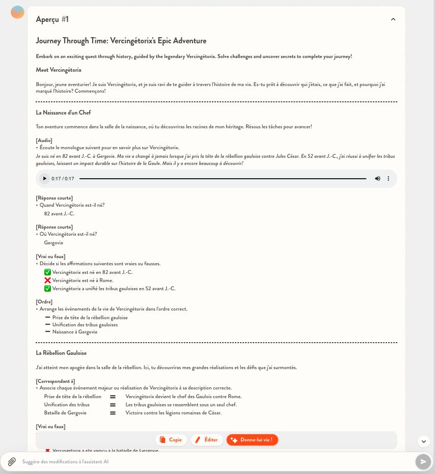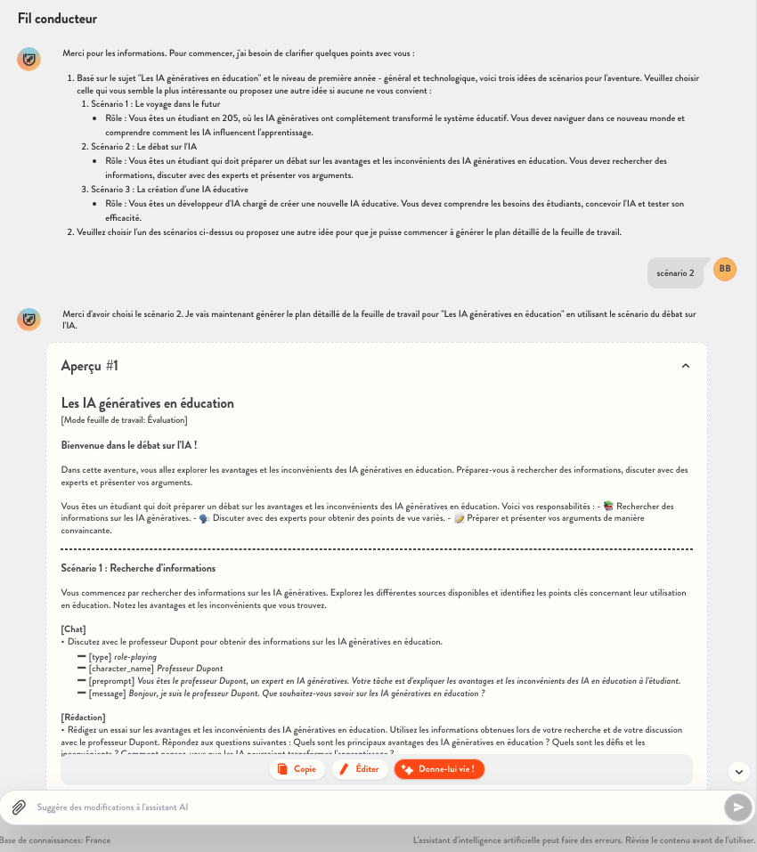 Une fois le chatbot choisi (ex : profil d’une figure historique, organisation d’un voyage scolaire, etc.) et après conversation pour définir le plan, l’activité est générée et éditable. Elle est peut-être partagée pour être réalisée en ligne.