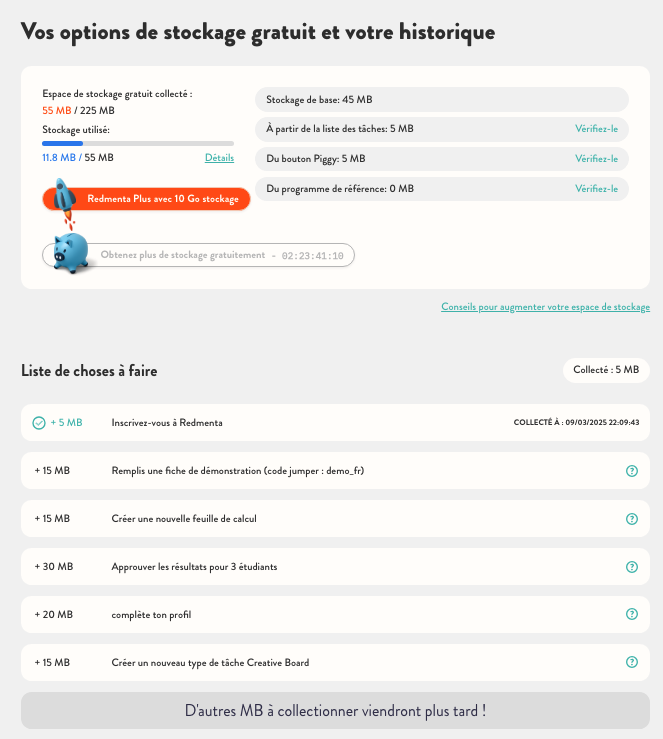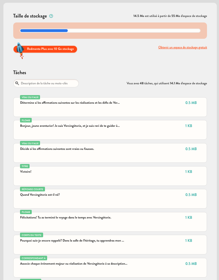 45 Mo de stockage gratuits (10 fiches) qui peuvent être augmentés à 225 Mo par diverses actions dans l’application. Supprimer une fiche ou une tâche fait récupérer de l’espace.