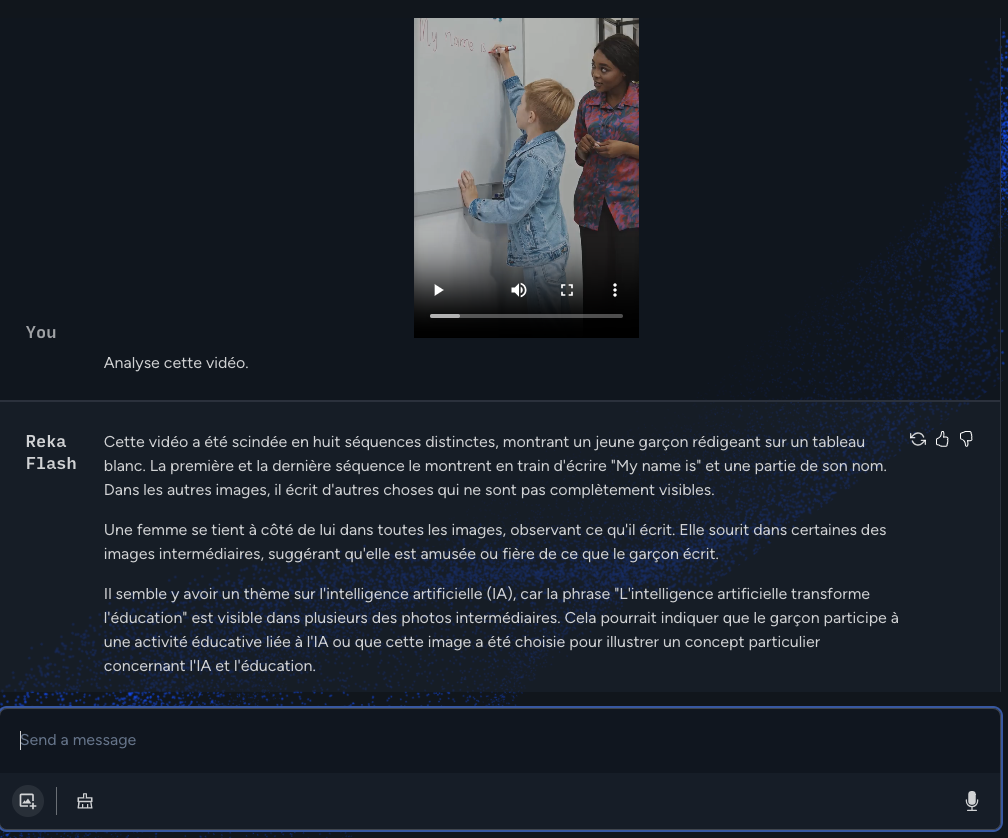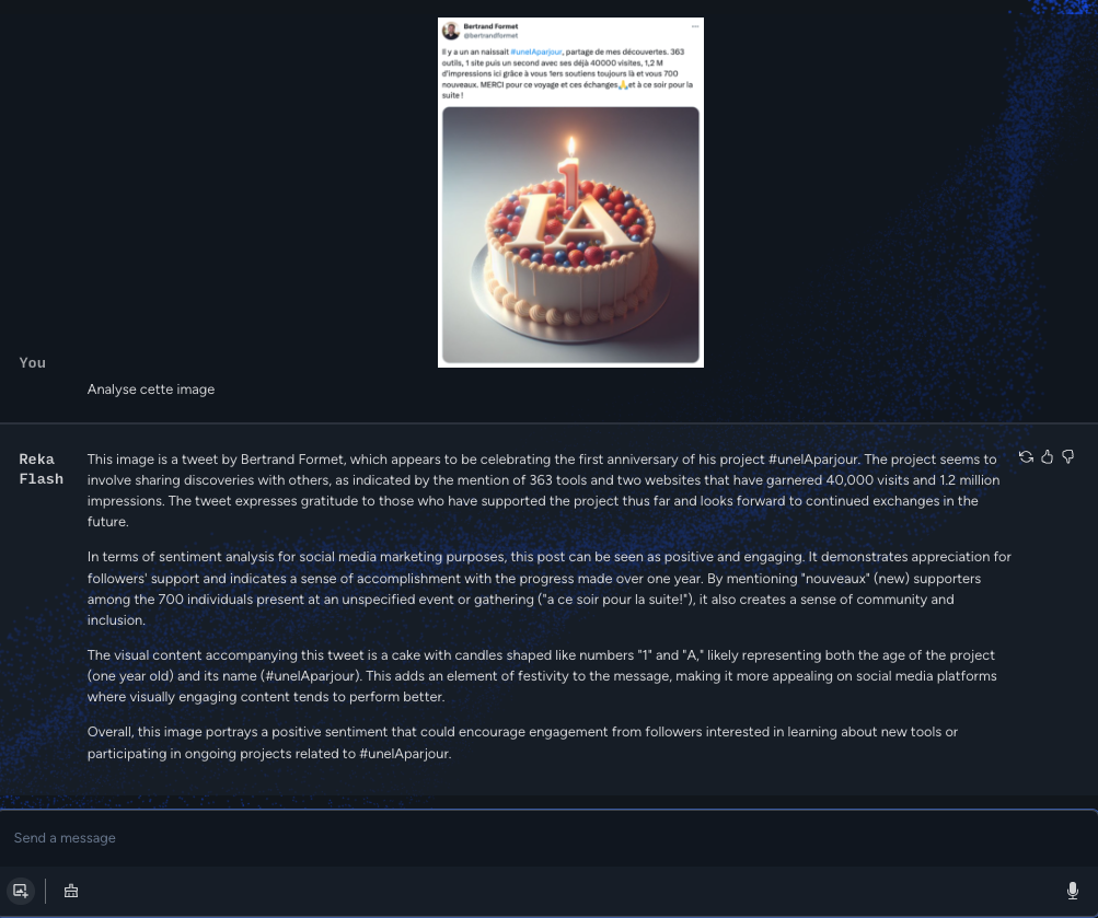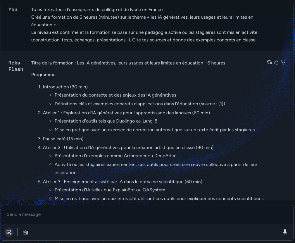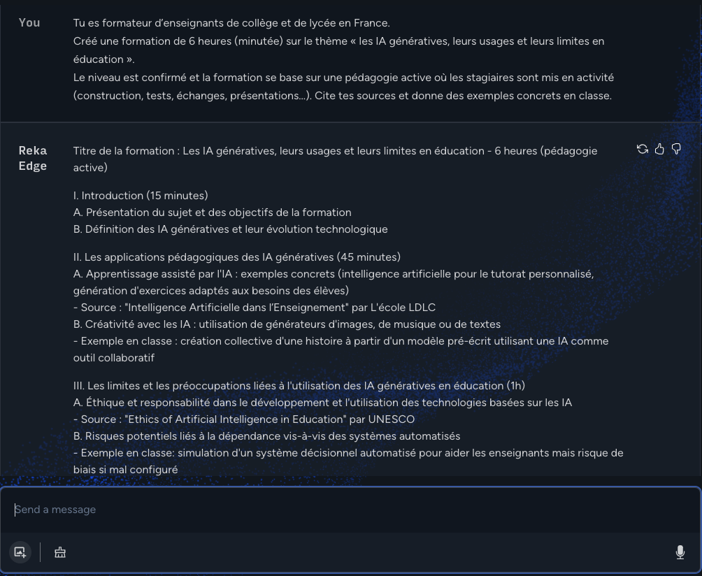 Reka (https://reka.ai) propose 2 modèles de langage, Edge – modèle « léger » – et Flash – proche des modèles actuels. Disponibles via https://chat.reka.ai/chat. Analyse images et vidéos. Requêtes audio. Réponses parfois en EN. Semble « connecté » et illimité.