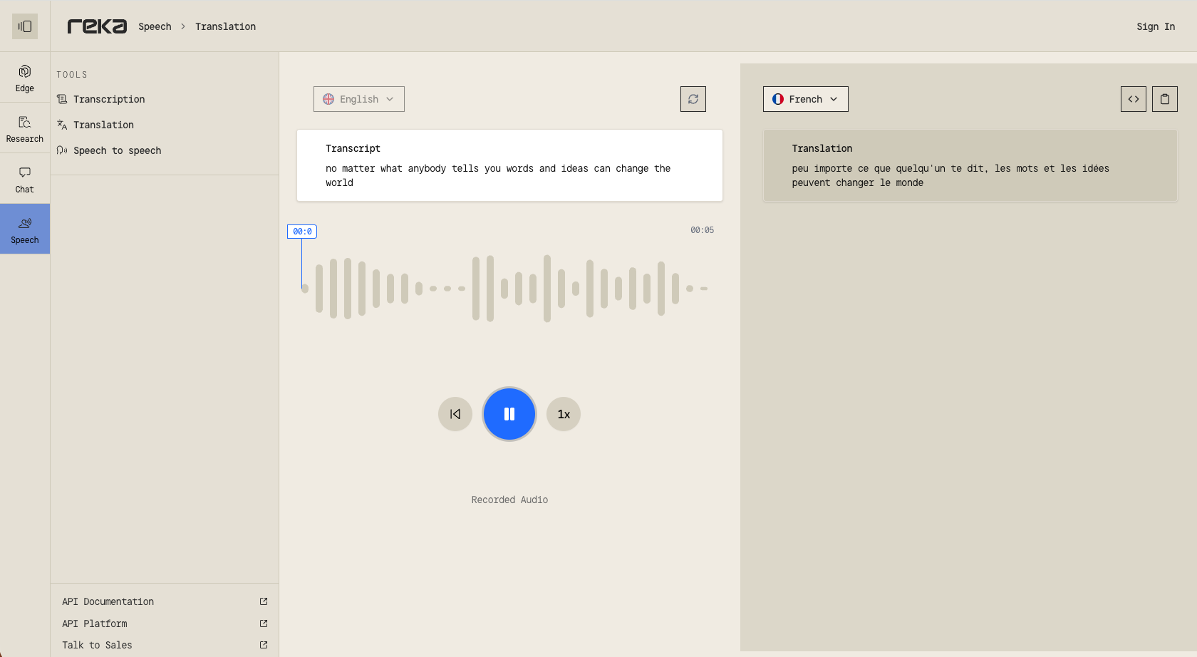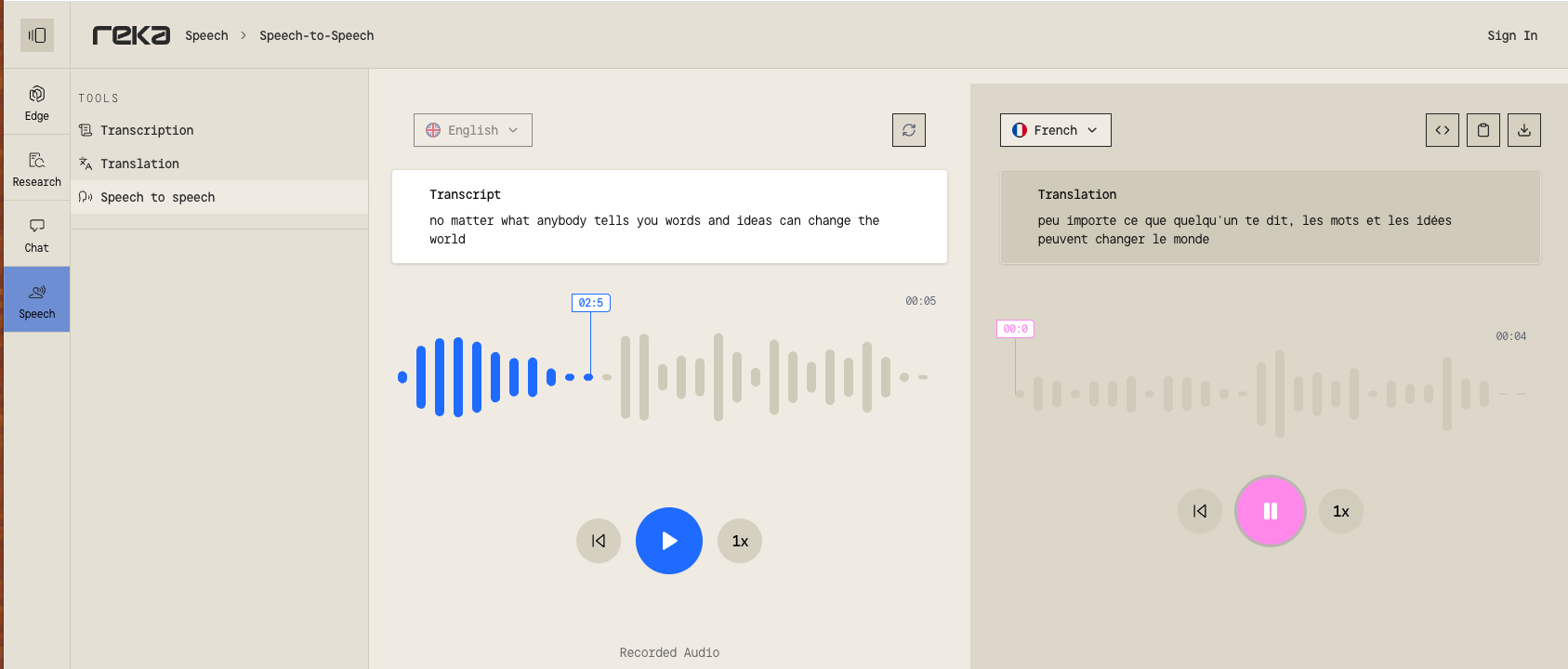 - Reka Speech : pour la transcription, la traduction et la génération d’audios voix.