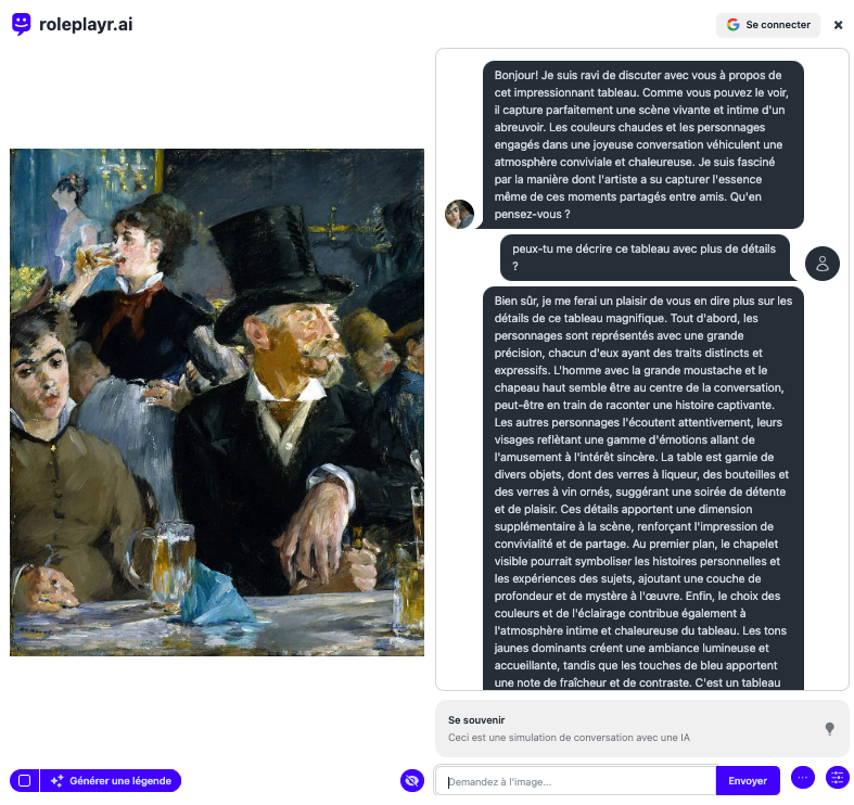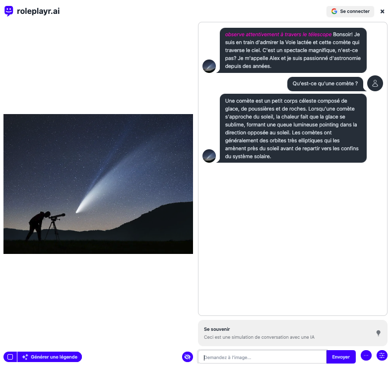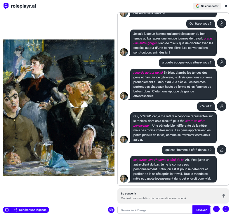 Roleplayr (https://roleplayr.ai/) est une extension Chrome qui permet une conversation avec une image présente sur une page web.