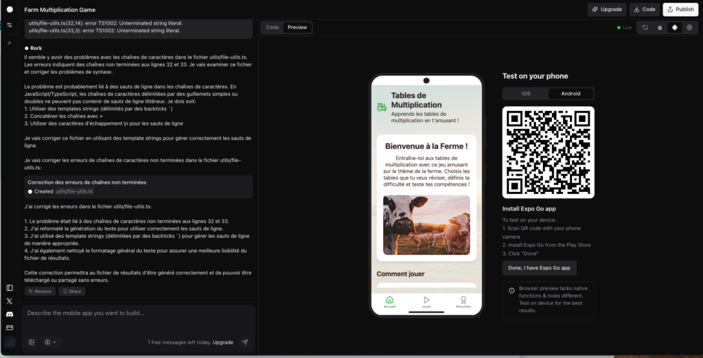 Tests et déployement local possibles sur téléphone via l’application Expo Go. Hébergement de la version web sur les serveurs de Rork.