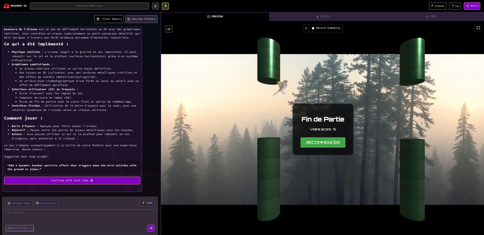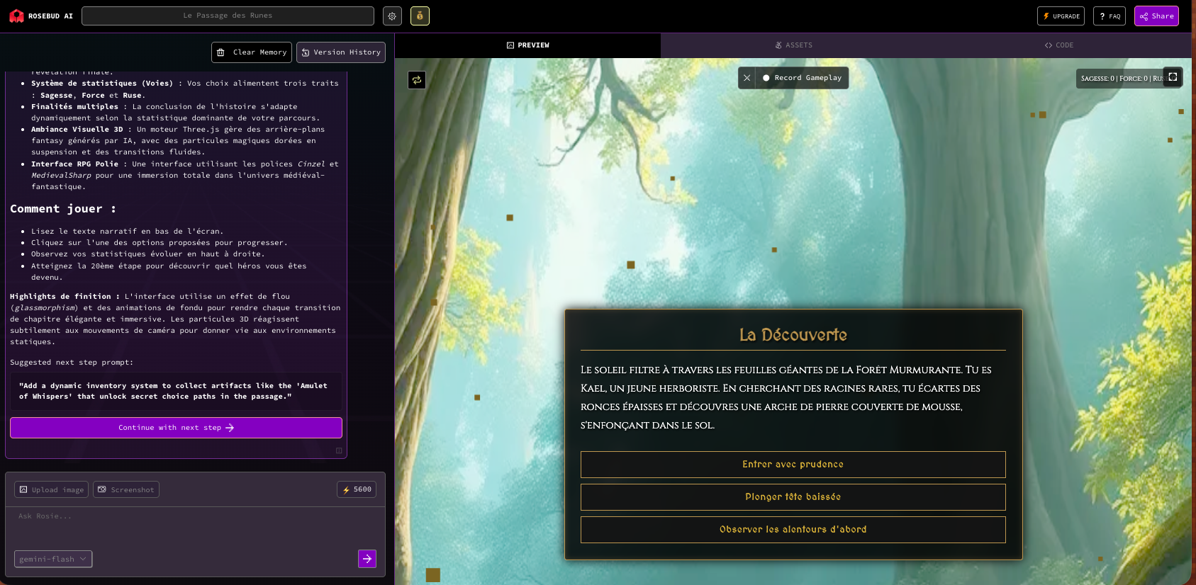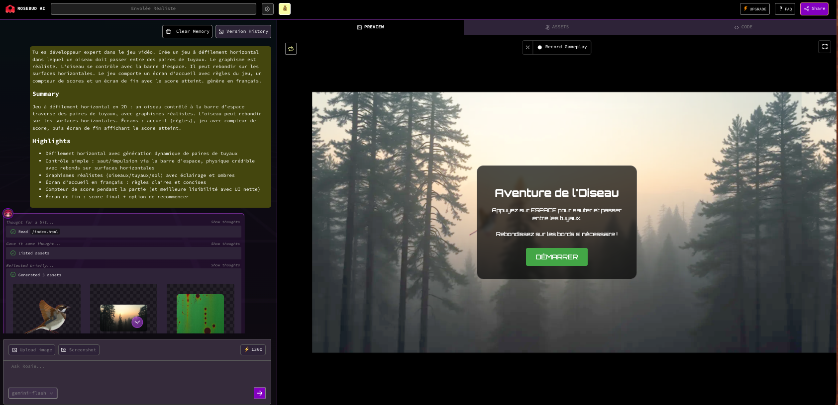 Après itérations avec un chatbot, Rosebud génère les graphismes puis le jeu. Les itérations peuvent continuer pour affiner.