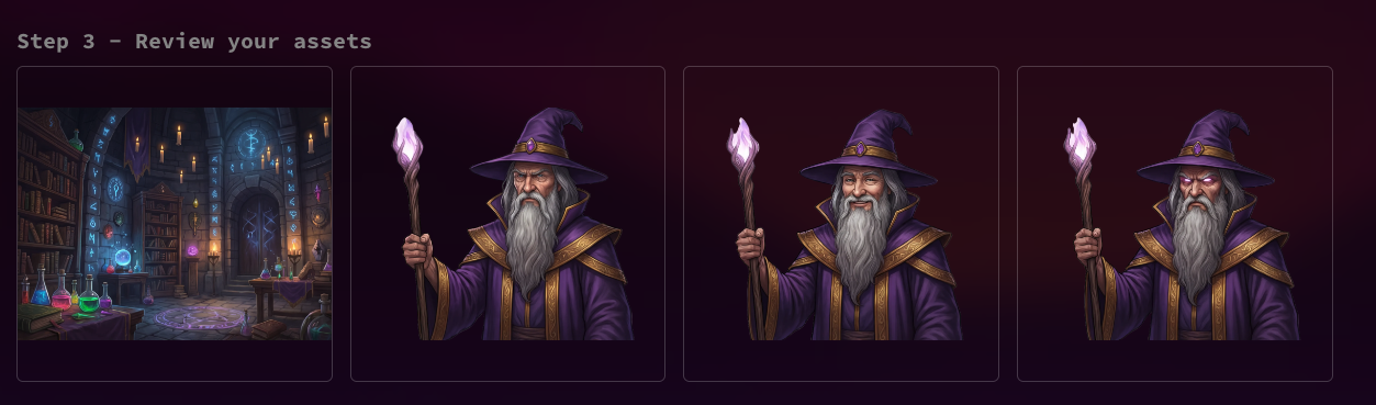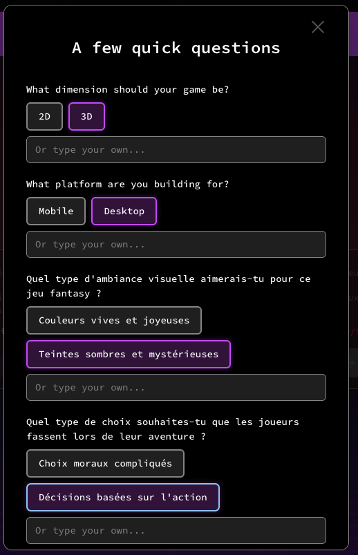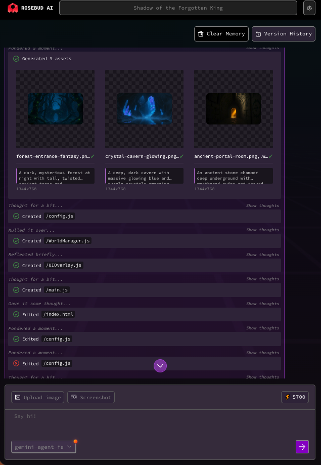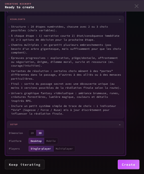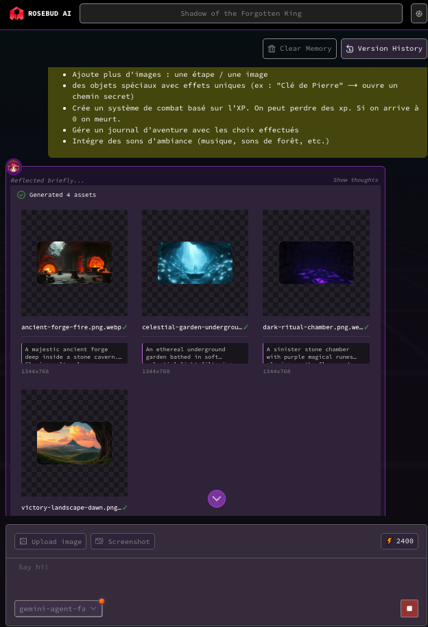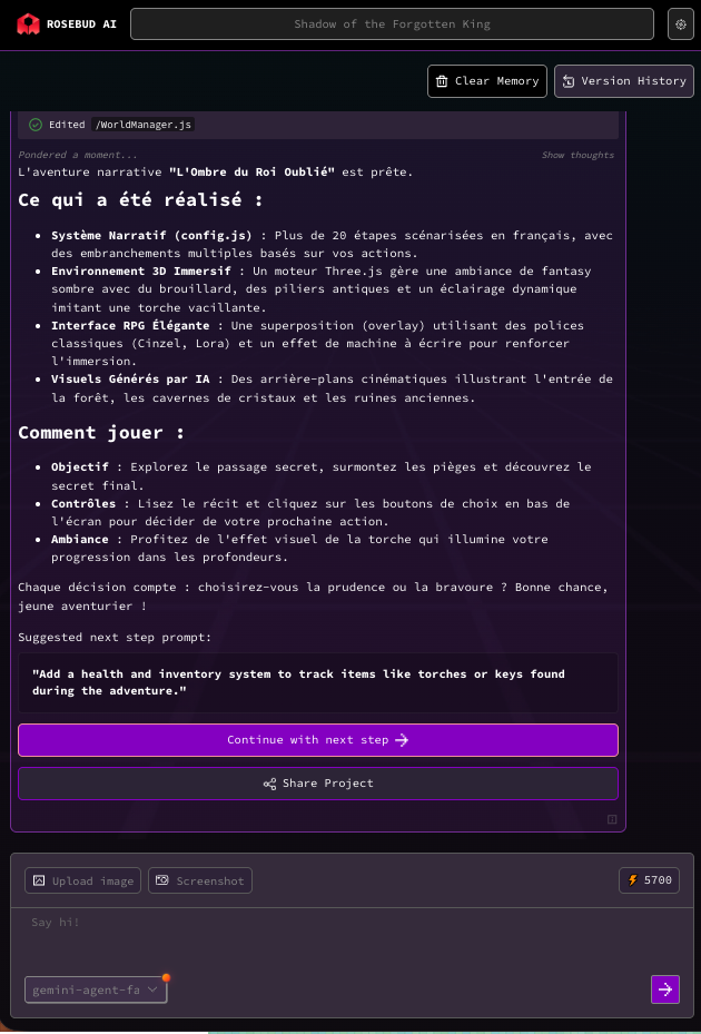 Après itérations avec un chatbot, Rosebud génère les graphismes puis le jeu. Les itérations peuvent continuer pour affiner.