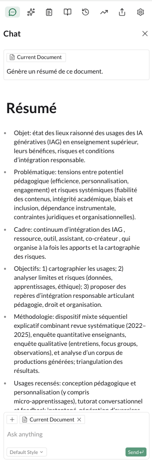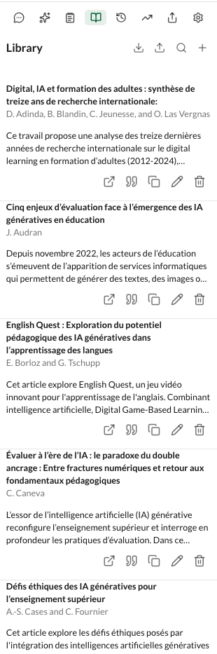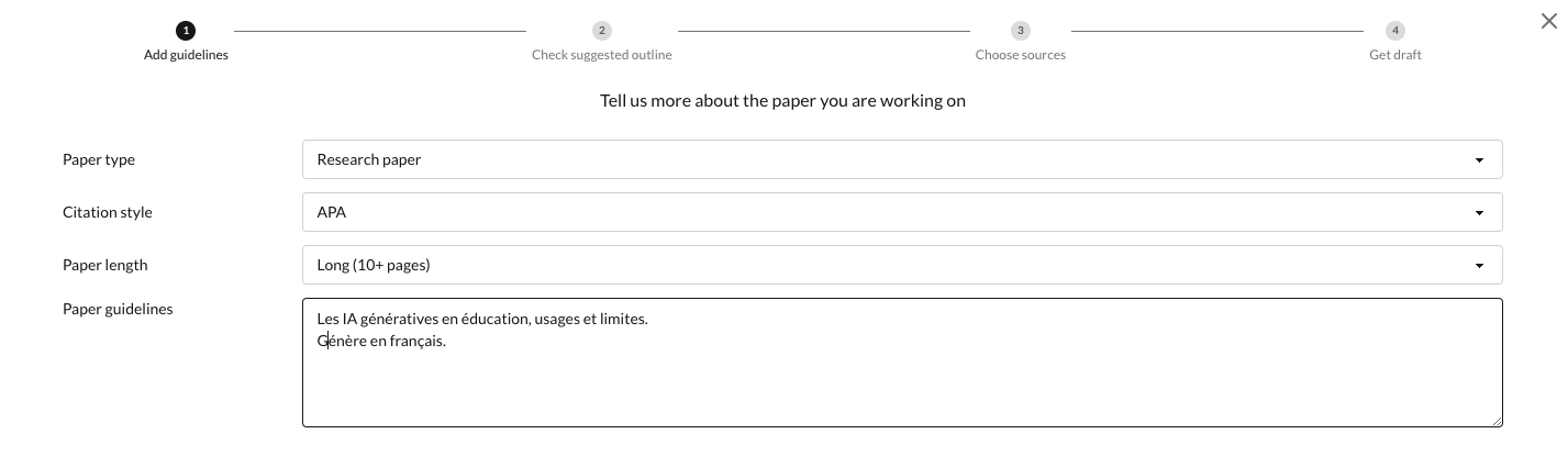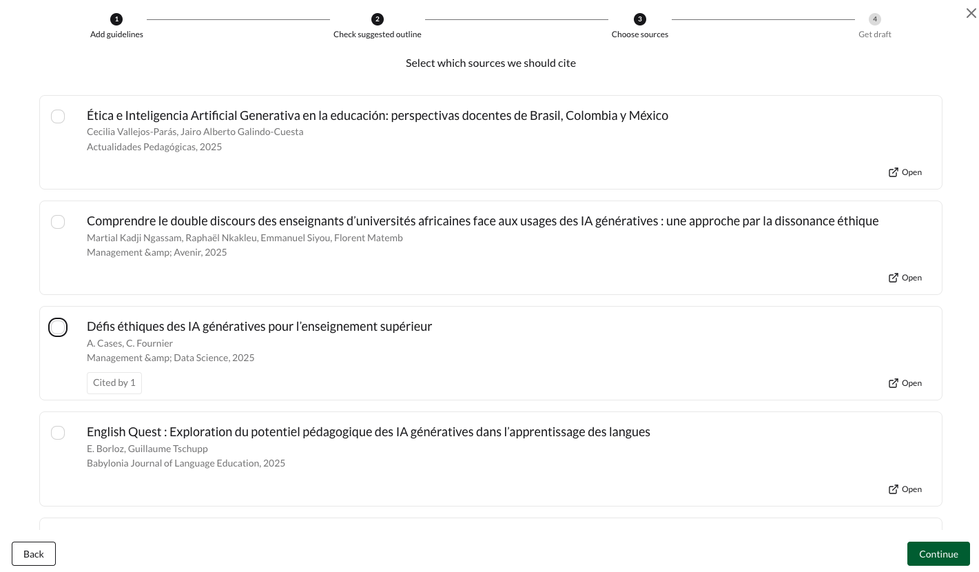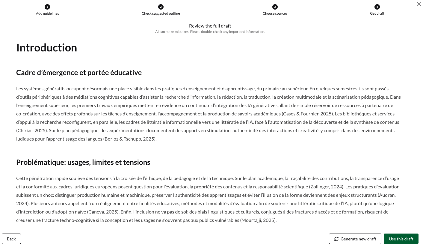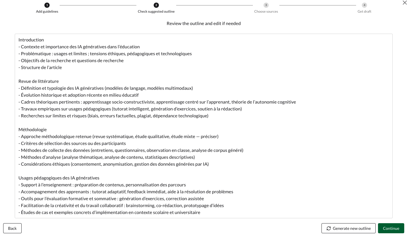Après définition du sujet, un plan éditable est généré puis une sélection d’articles scientifiques à choisir est proposée avant la génération du brouillon.