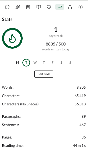 Le long texte généré (36 pages dans le texte ci-dessous) est modifiable dans une interface type traitement de texte et des outils sont proposés : chatbot, notes, assistant IA, bibliothèque et statistiques.