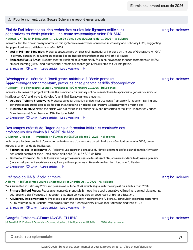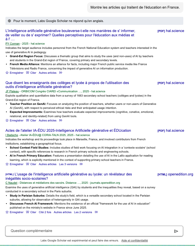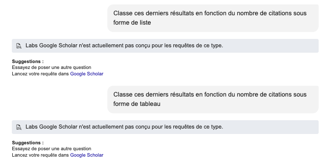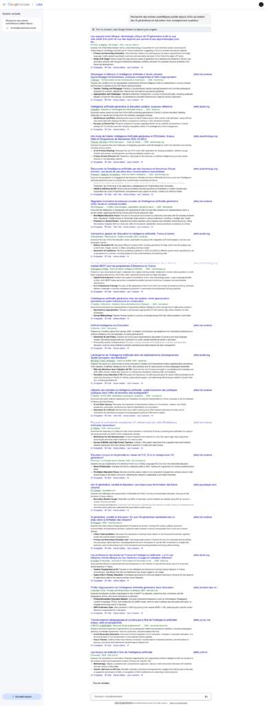 Scholar Labs (https://scholar.google.fr/) est un moteur de recherche en langage naturel expérimental intégré à Google Scholar, accessible depuis la barre de menus.
