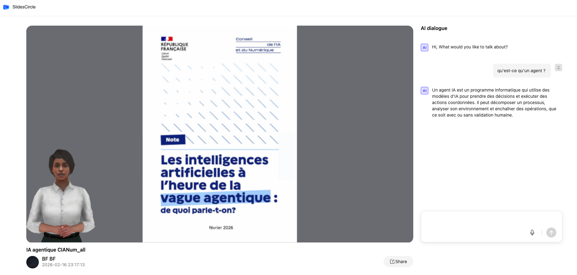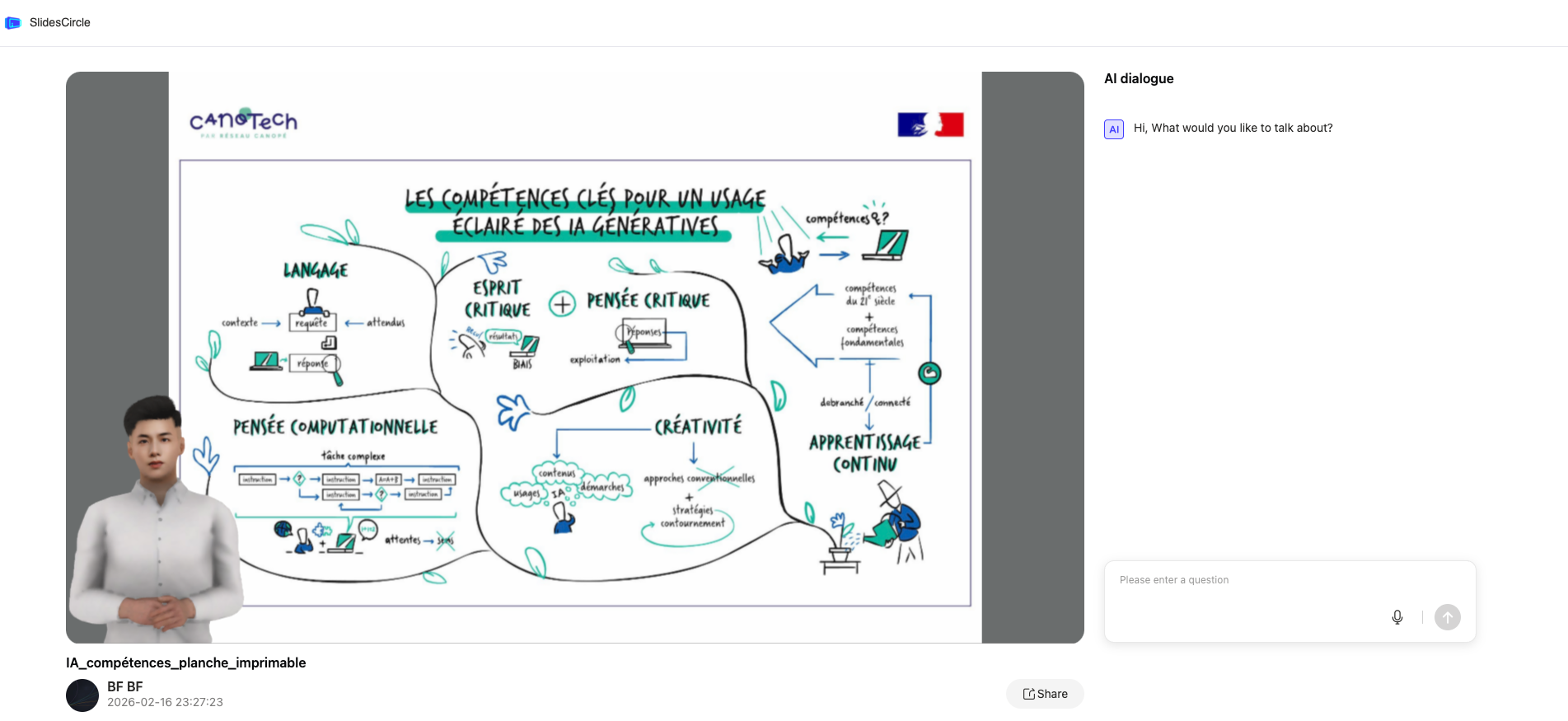 Slides orator (https://www.slidesorator.com/) génère une vidéo explicative avec un avatar 3D audio à partir d’un pdf.