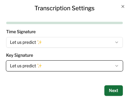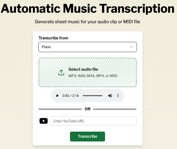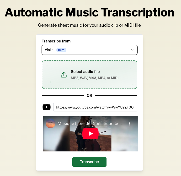 Songscription (https://songscription.ai) génère la partition transcrite d’un morceau de musique depuis un morceau chargé (formats mp3, wav, mp4, m4a, midi) ou une vidéo Youtube.