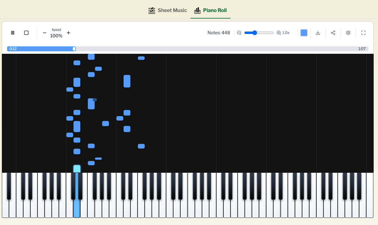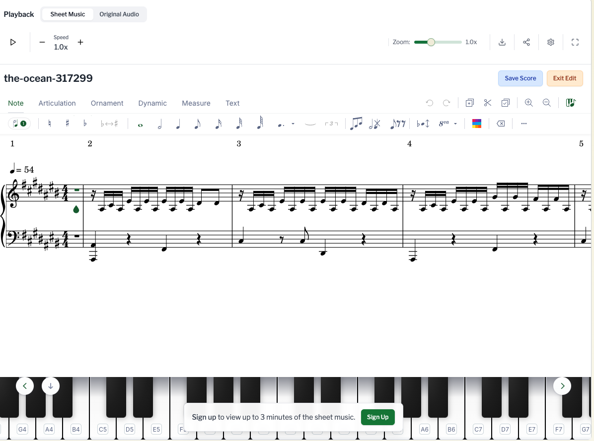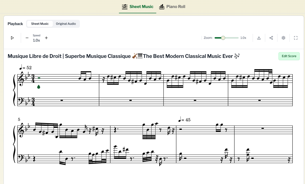 Édition des notes transcrites, version piano proposée. Export pdf.