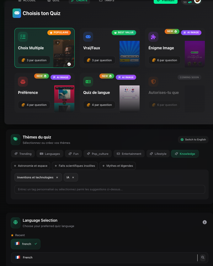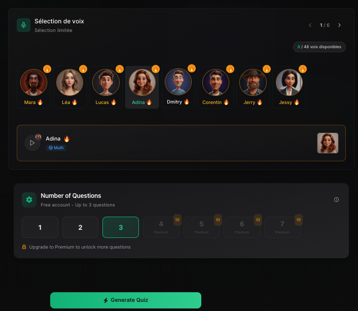 30 thèmes, 48 voix, 6 types de quiz, réglages fins, format portrait ou paysage.