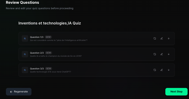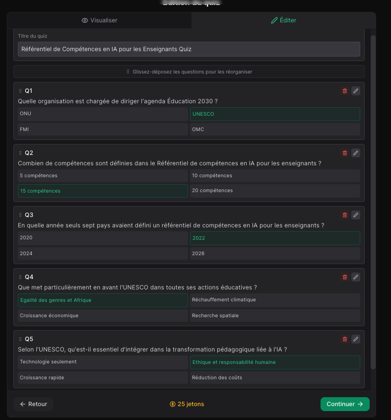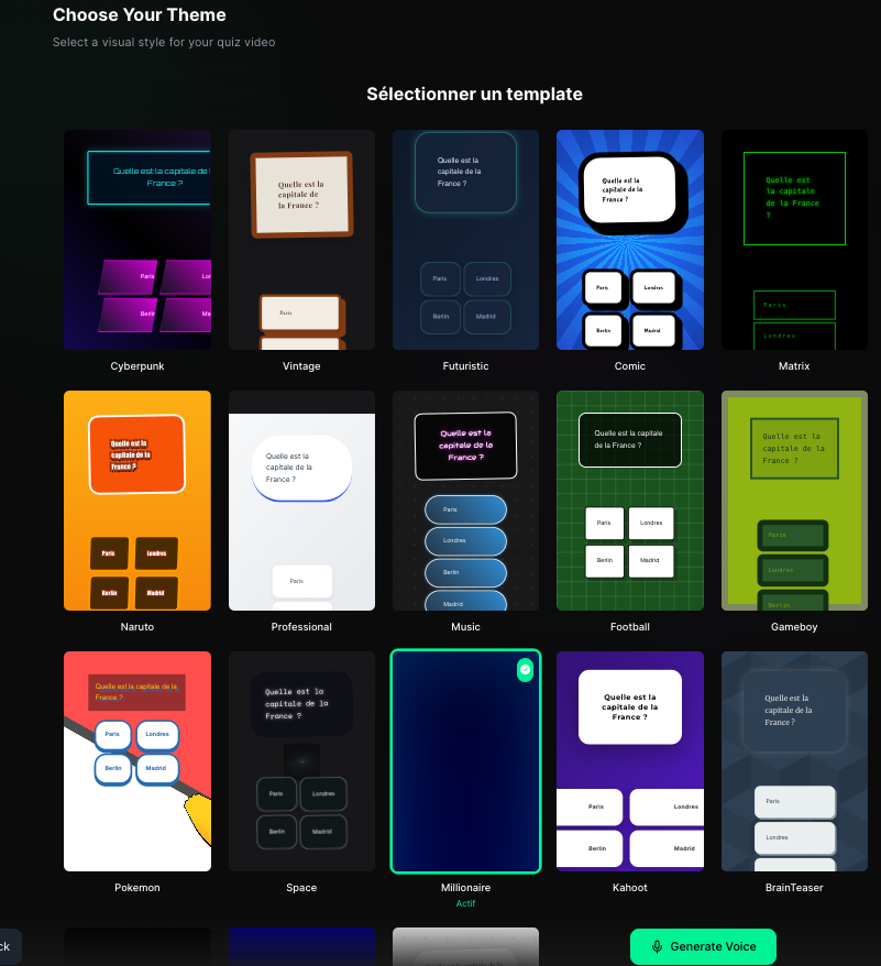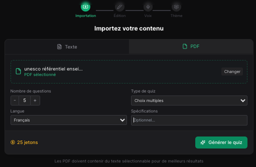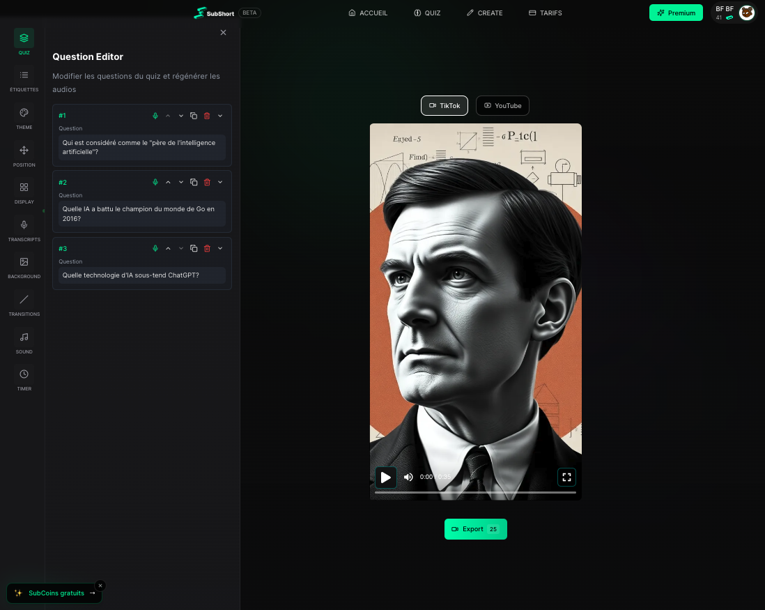 Subshort (https://www.subshort.co/fr) génère des quiz vidéo à la manière de ceux visibles sur les réseaux sociaux. Génération à partir de mots clés, de texte collé ou de pdf.