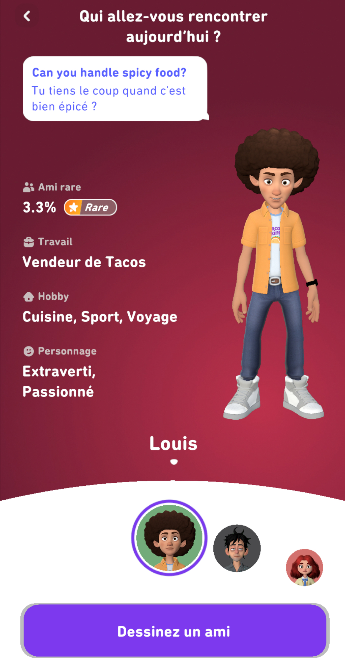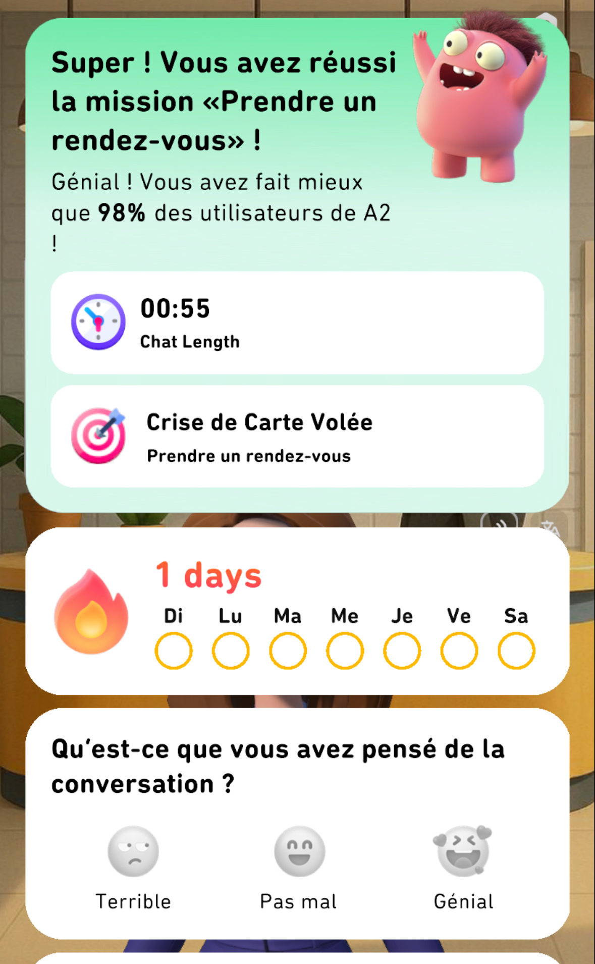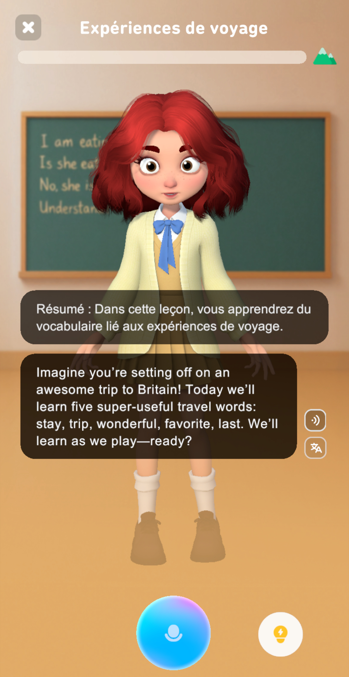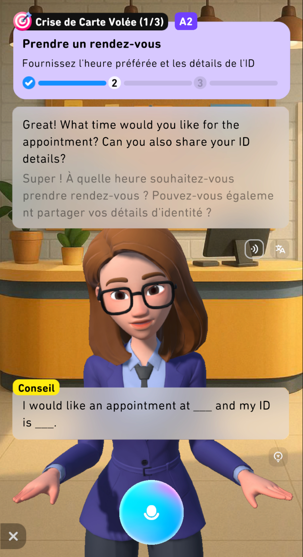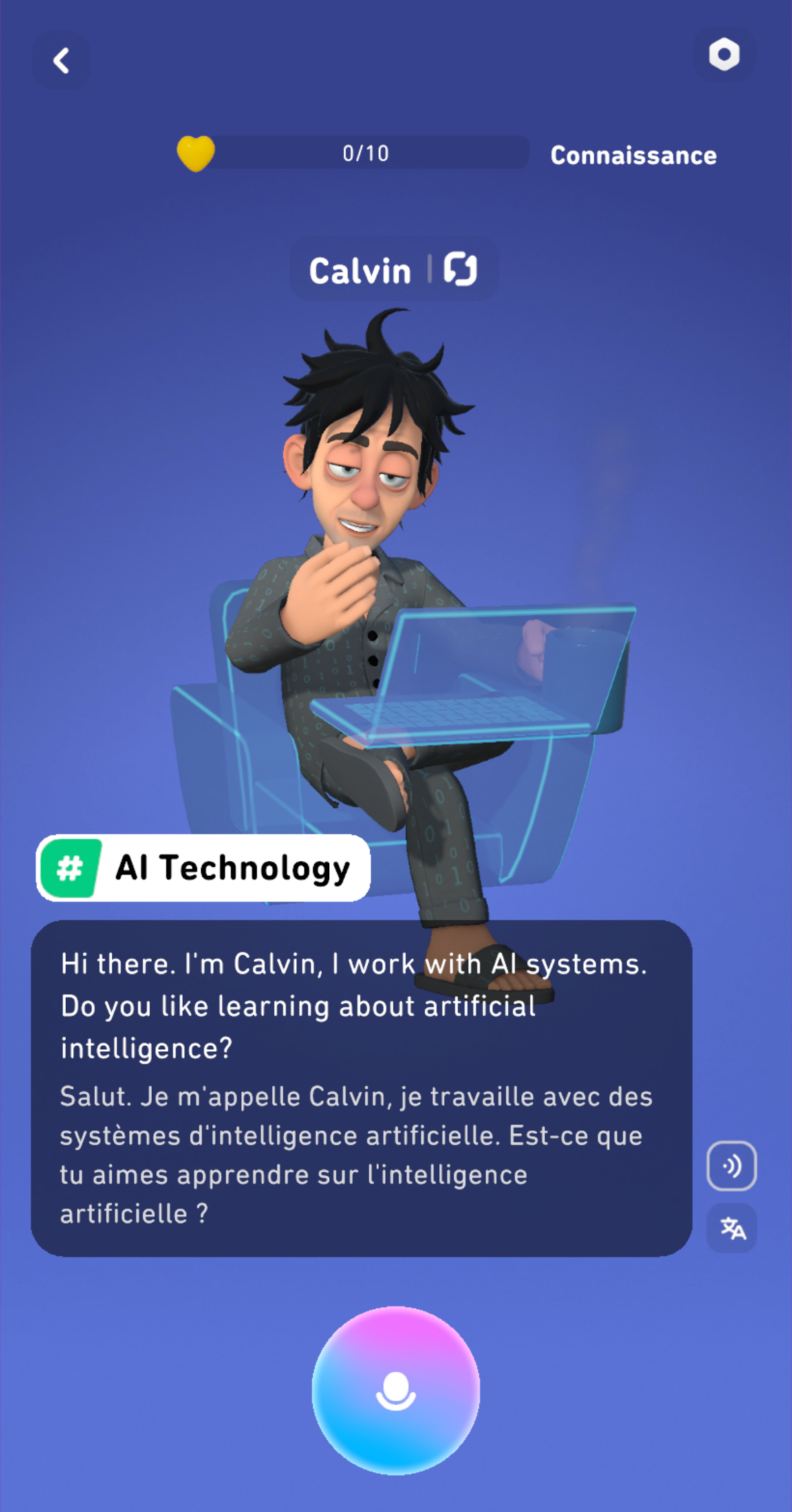 Basés sur l’oral, la conversation et la reconnaissance vocale, les dialogues avec les personnages 3D sur des situations réalistes s’adaptent en fonction des réponses fournies.