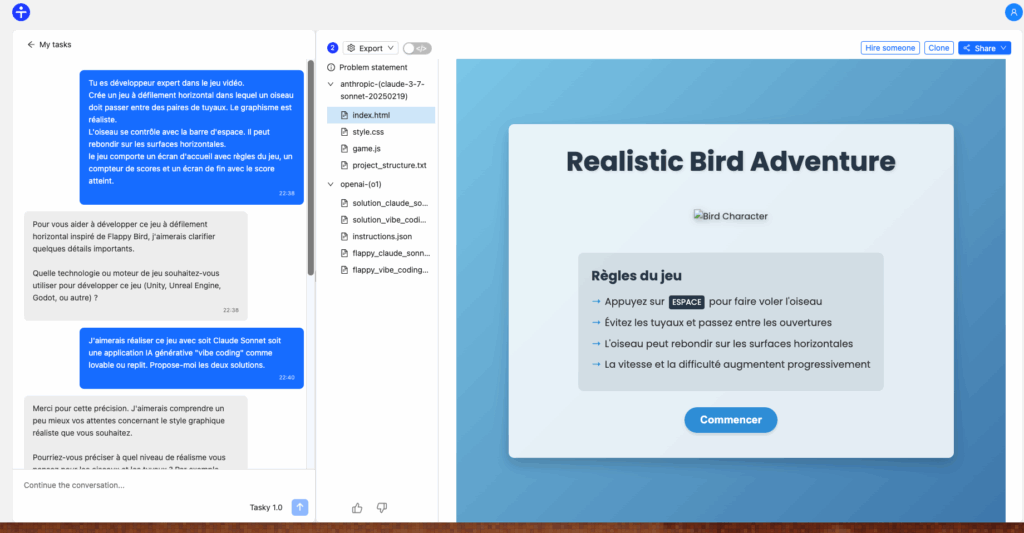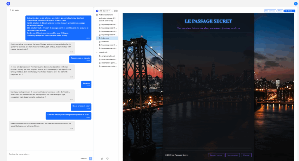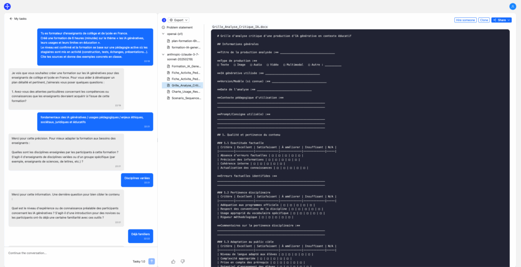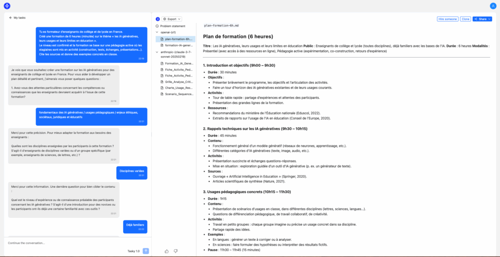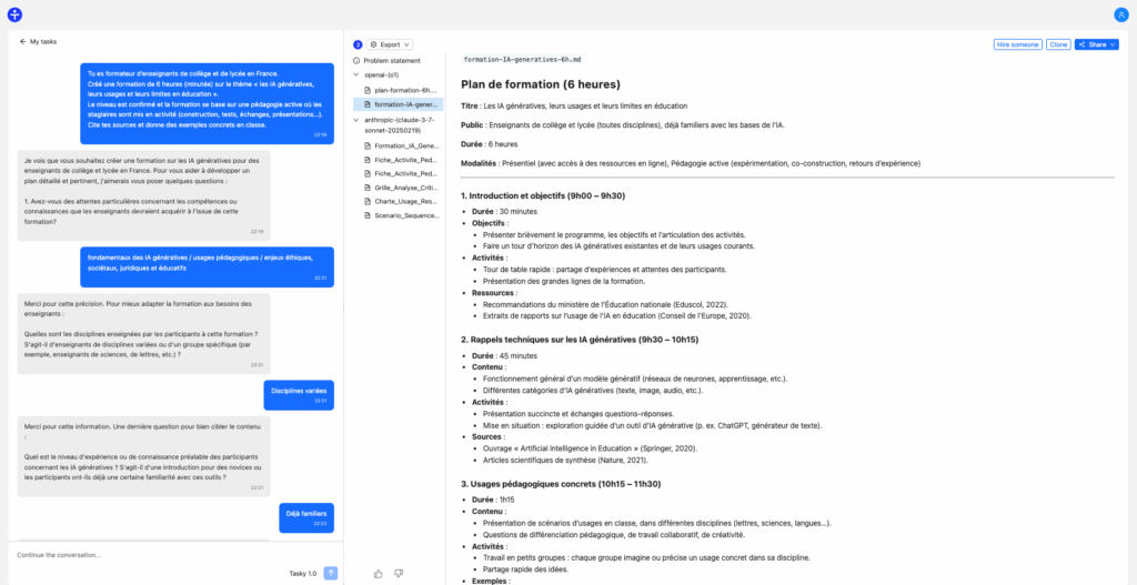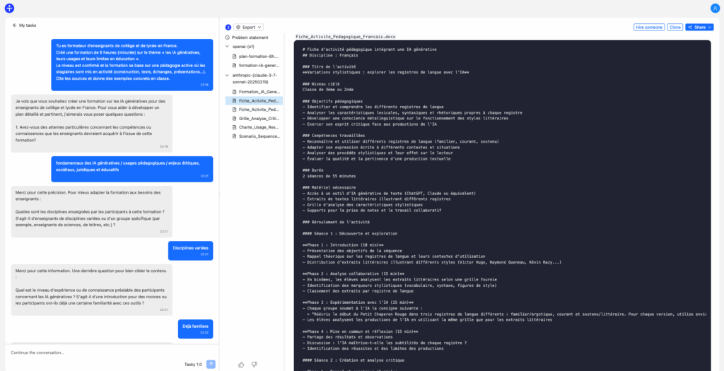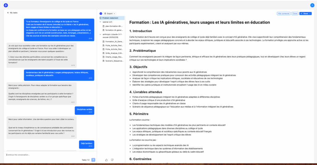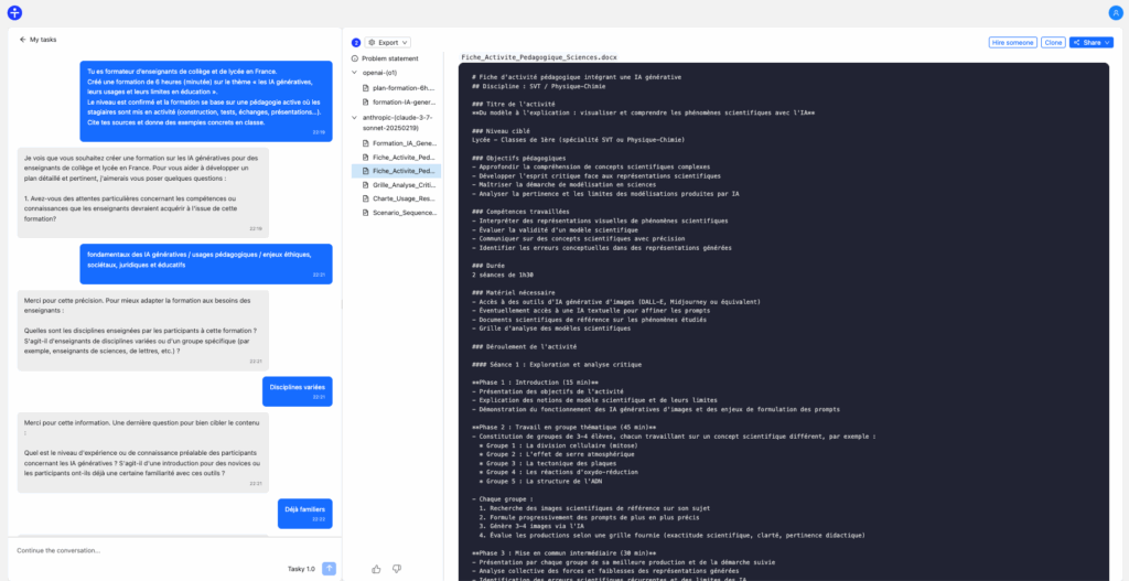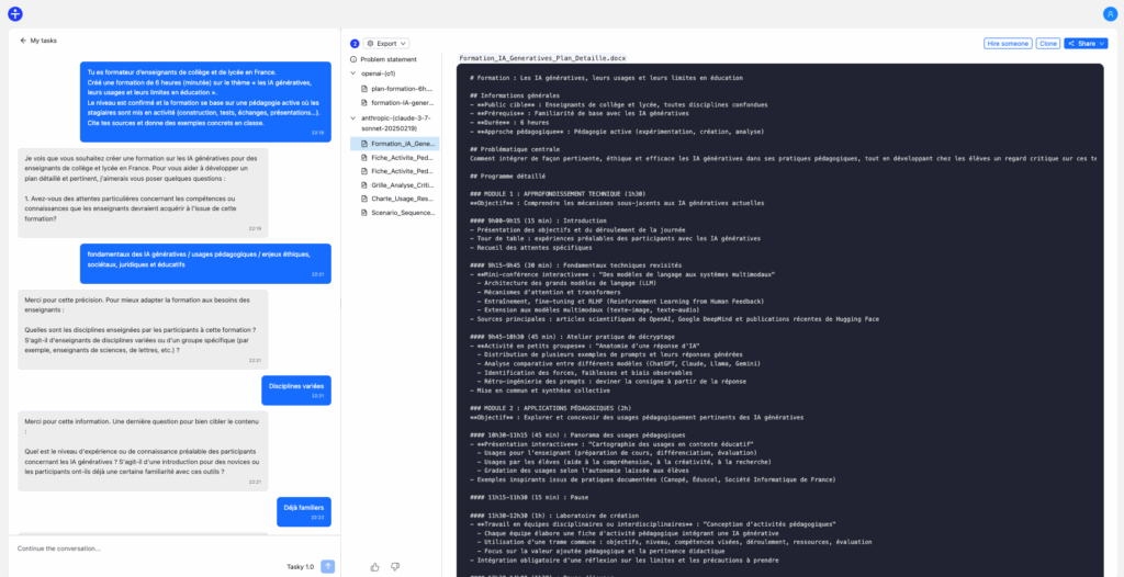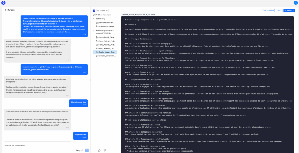 À partir d’une instruction, Tasky va poser des questions pour approfondir sa compréhension du sujet. Après avoir exposé les étapes du problème posé, la réponse et les documents liés sont générés en se basant sur ChatGPT O1 et Claude Sonnet 3.7. L’itération est ensuite possible pour affiner les générations.
