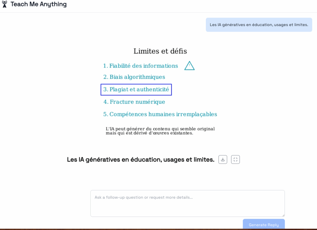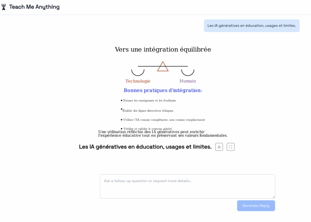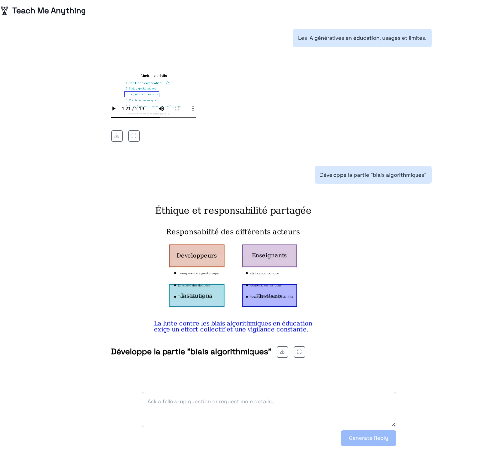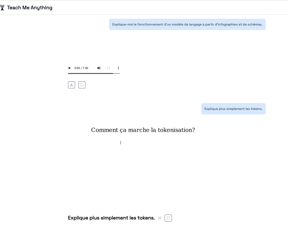 Teach me anything (https://tma.live) génére une vidéo explicative à partir d’une instruction. Vidéo générée à la manière d’une présentation animée et commentée avec texte, illustrations et voix (une seule voix de femme disponible même si spécifié dans l’instruction).