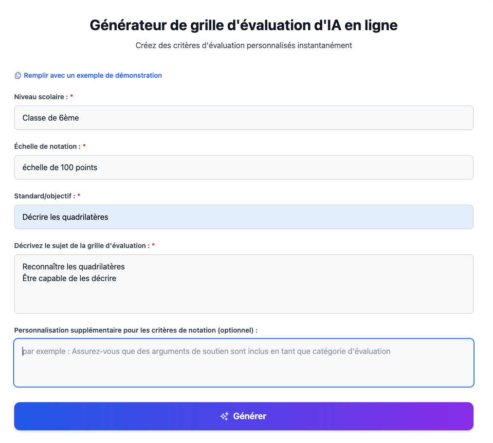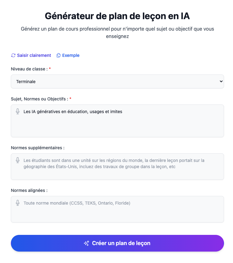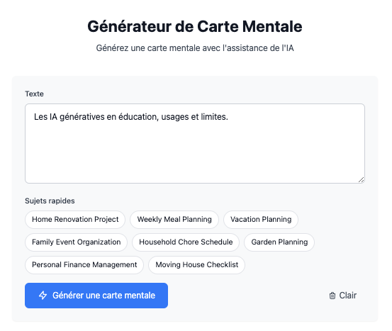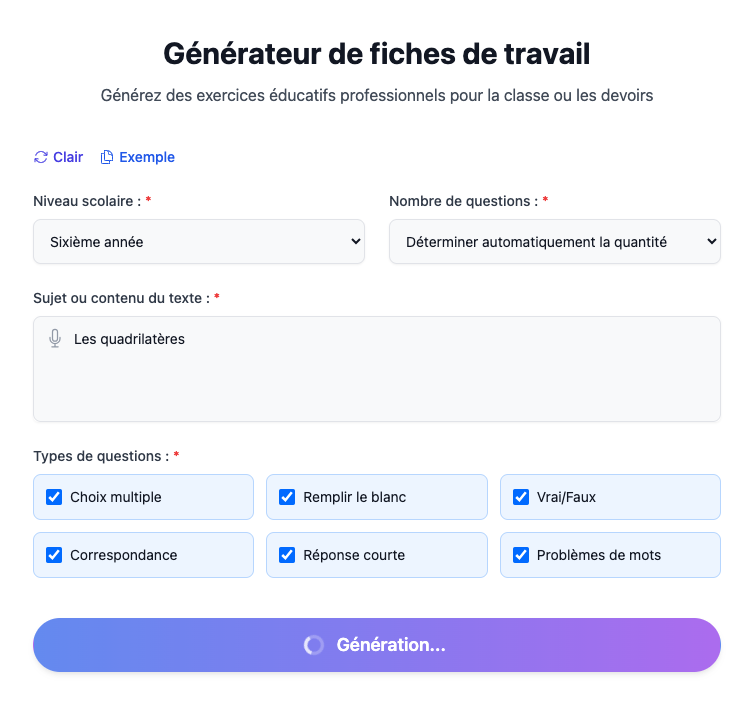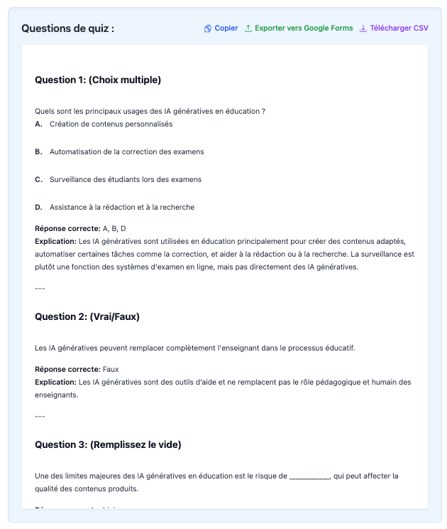 Teachany (https://www.teachany.com) regroupe des outils de génération pour l’enseignement : plan de cours, quiz, fiche de travail, grille dévaluation, coloriage, carte mentale, etc.