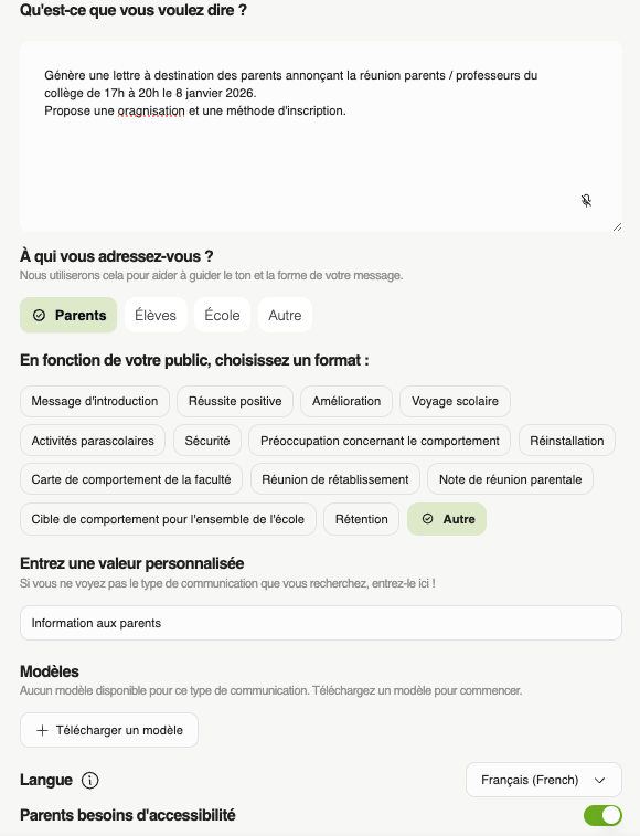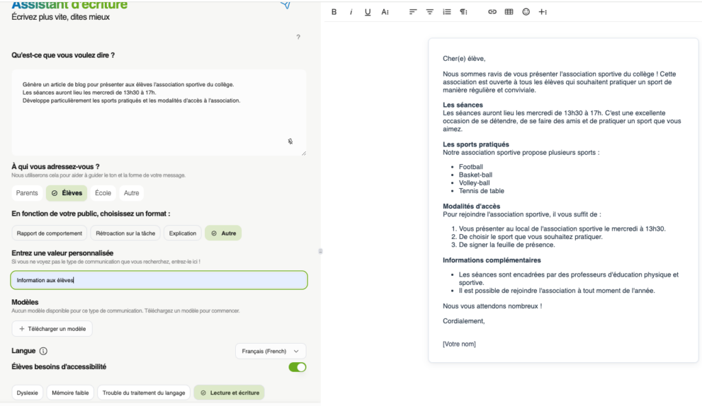 - assistant de rédaction : génère des textes dans un contexte scolaire, courrier, information, notes…