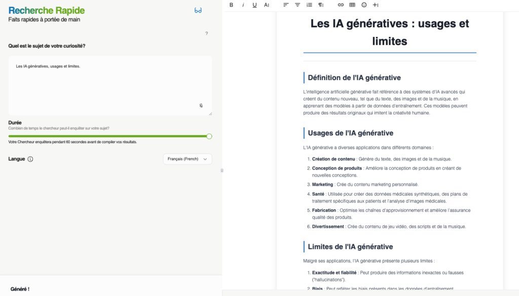 - chercheur rapide : génère un texte explicatif.
