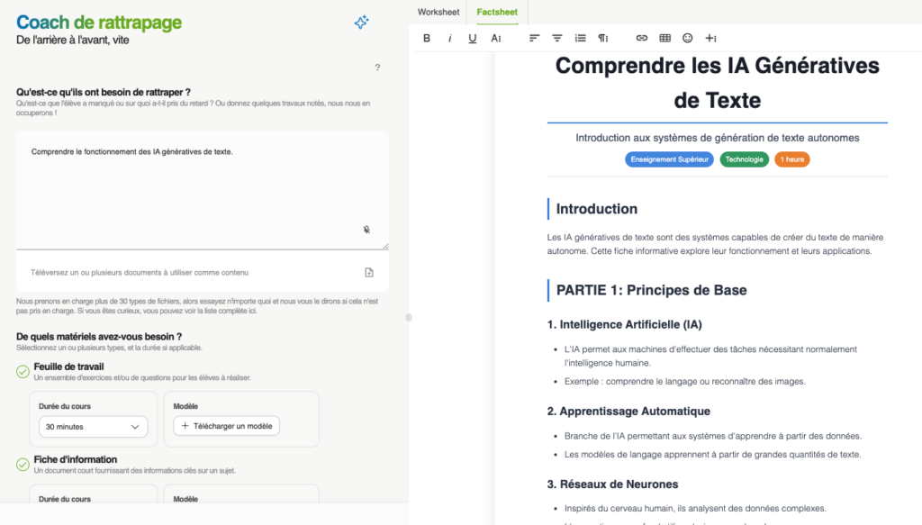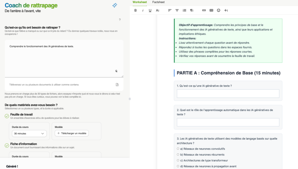- coach de rattrapage : propose un programme de révision et des exercices liés.