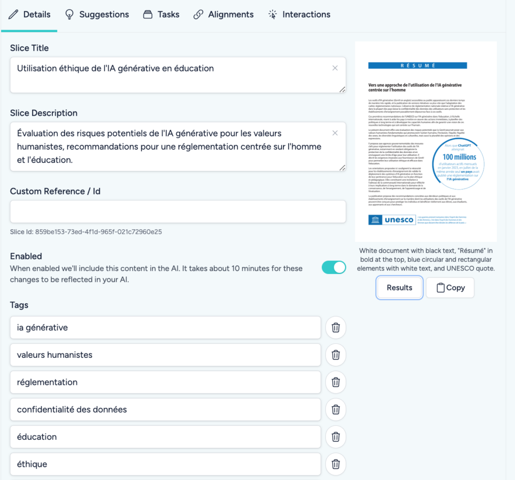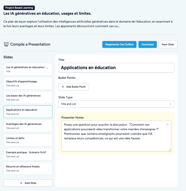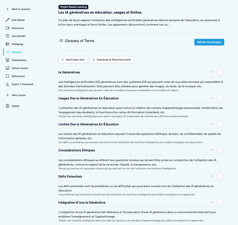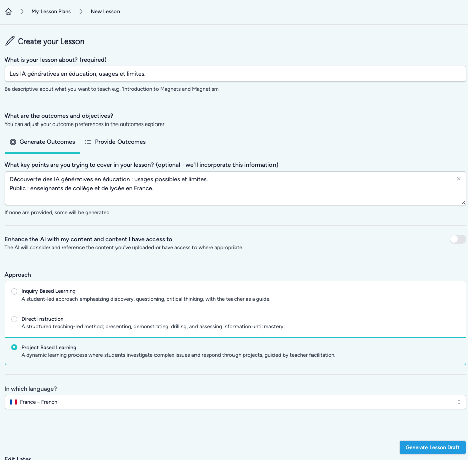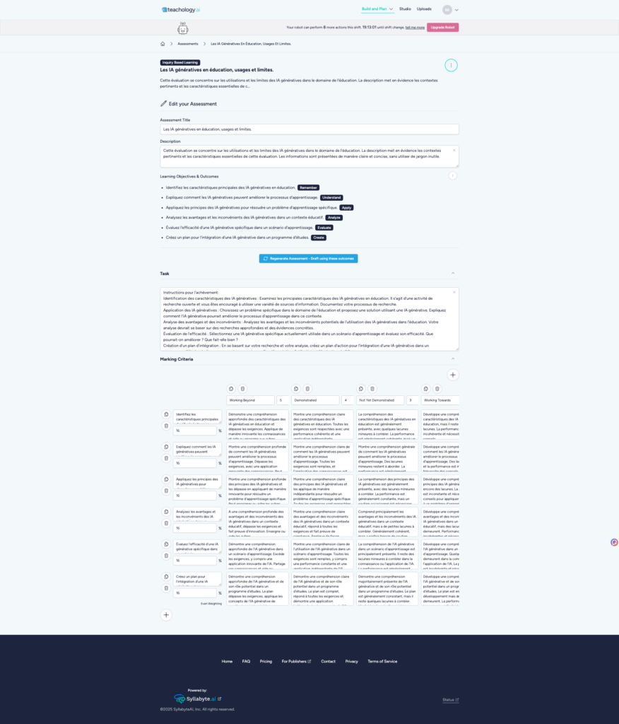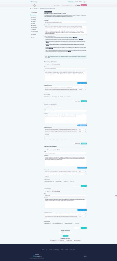 Teachology (https://www.teachology.ai) accompagne la génération de séance à partir d’instructions : choix pédagogiques, découpage, glossaire, consignes, compétences, quiz, plan de présentation et analyse fine de documents. Interface en anglais mais FR dans les générations si spécifié au 1er écran. Test documents depuis orientations UNESCO.