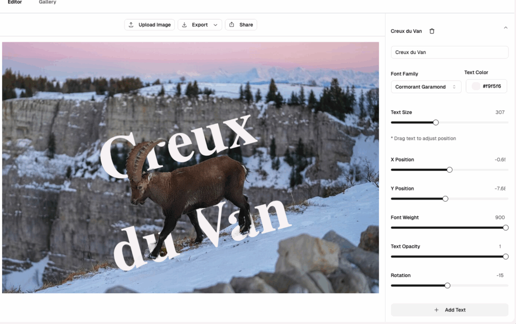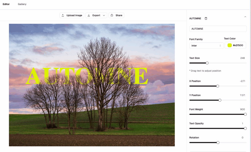 Réglages fins du texte : position, police (pas de prise en compte du choix lors du test), couleur, opacité, rotation…