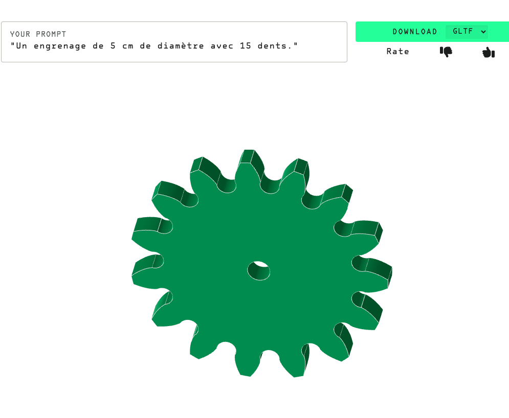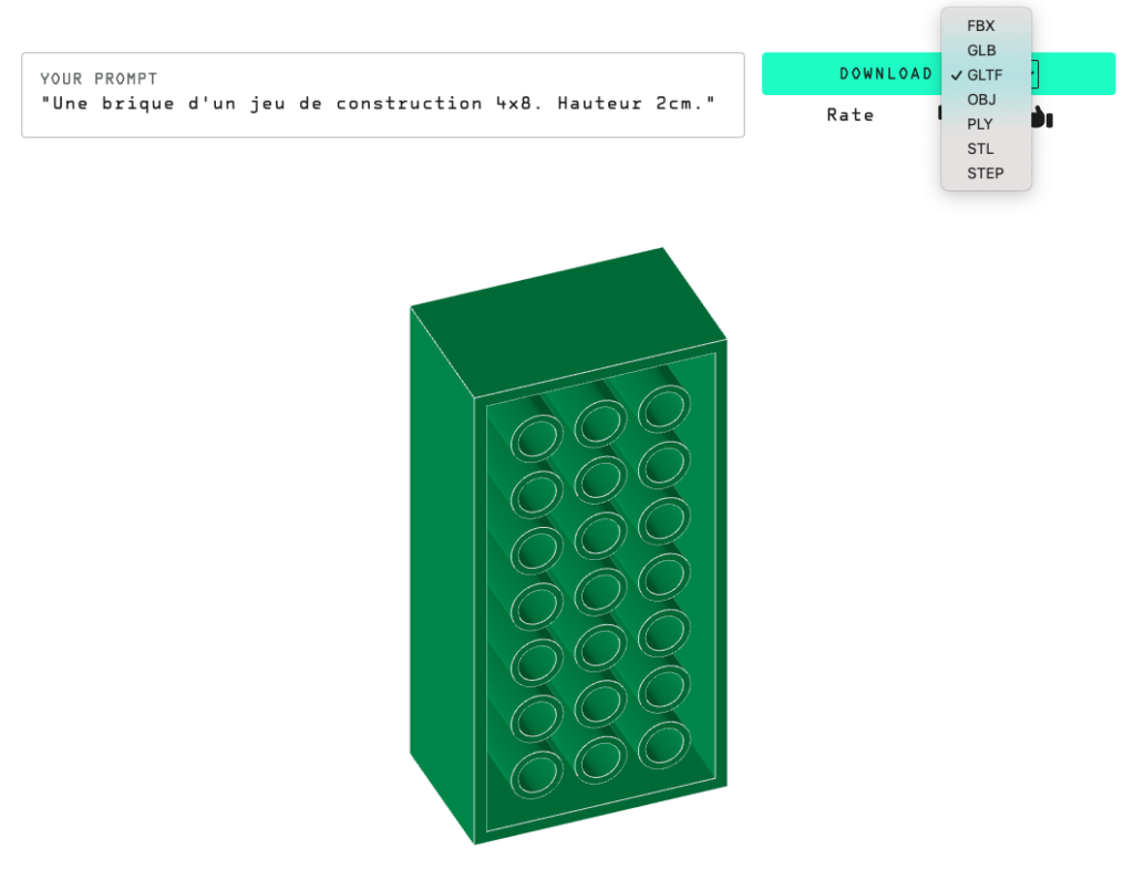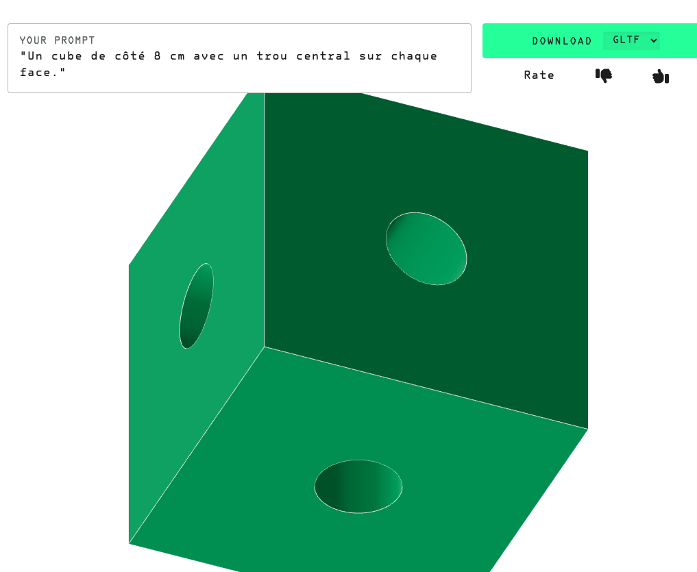 Text to CAD (https://text-to-cad.zoo.dev) génère des modèles 3D à partir d’une instruction. 7 formats d’export proposés. Quelques difficultés remarquées mais assez performant. Français accepté. Version alpha gratuite et illimitée.