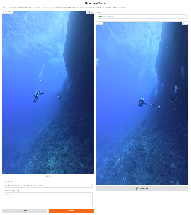 ThinkSound (démo : https://huggingface.co/spaces/FunAudioLLM/ThinkSound et documentation : https://github.com/FunAudioLLM/ThinkSound) génère la bande son de vidéos en la synchronisant et en ajoutant directement au fichier original, avec ou sans instructions.