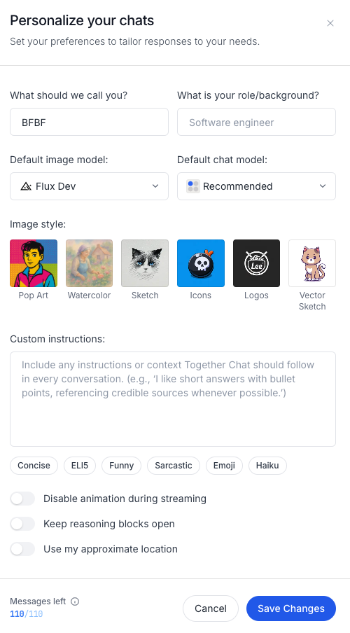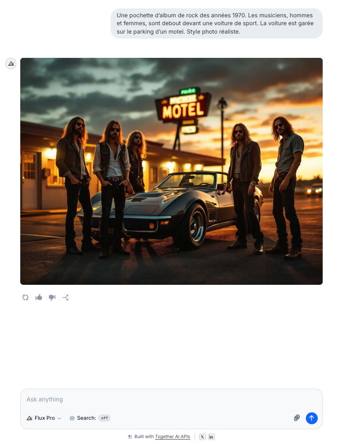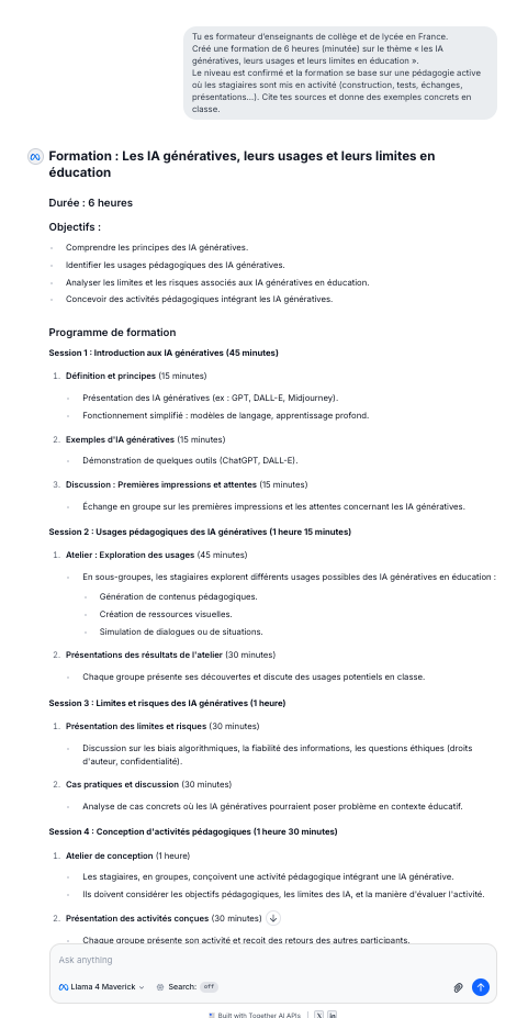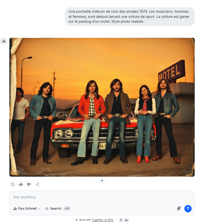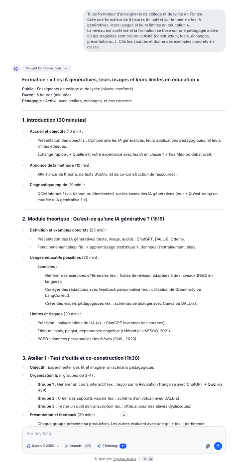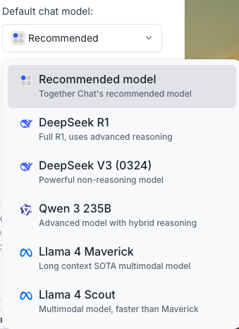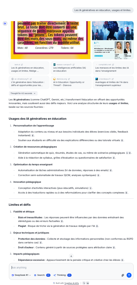 Together Chat (https://chat.together.ai) est un chatbot regroupe plusieurs modèles de langage (Deepseek R1 et V3, Qwen 3, Llama Maverick et Scout) et les 3 modèles d’images Flux (Schnell, Dev et Pro).
