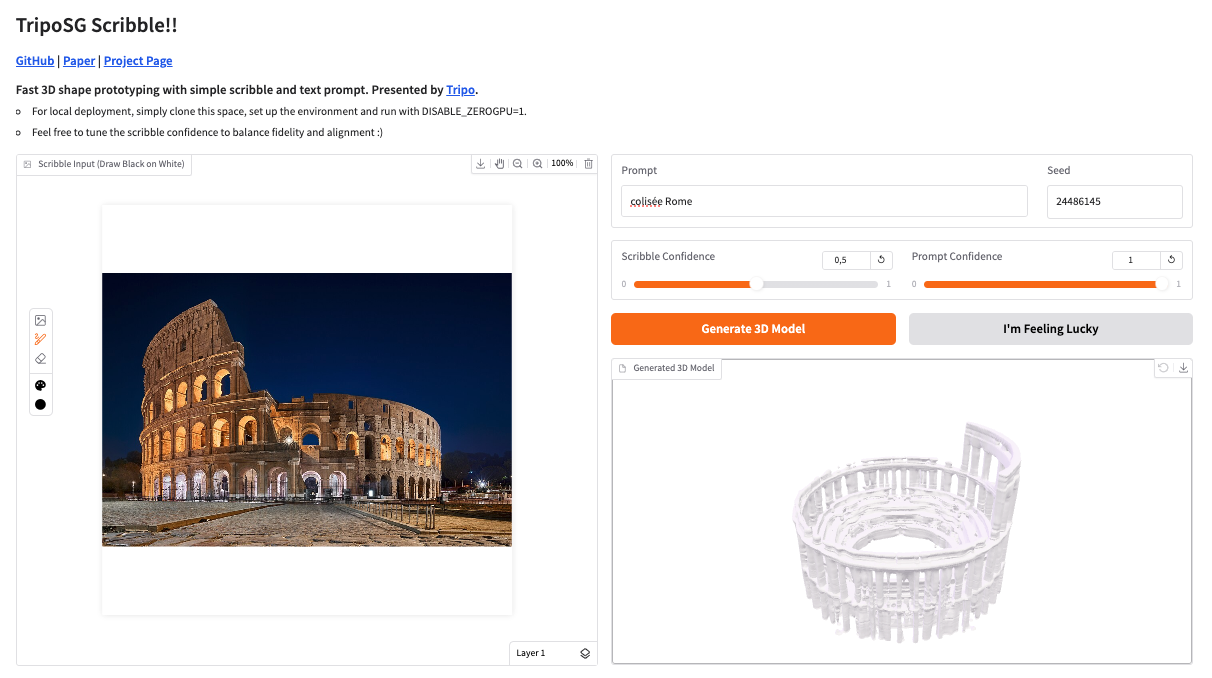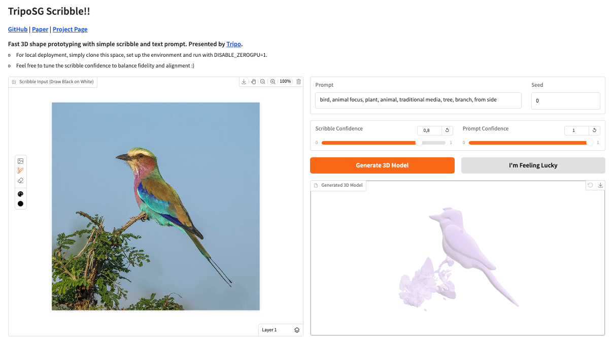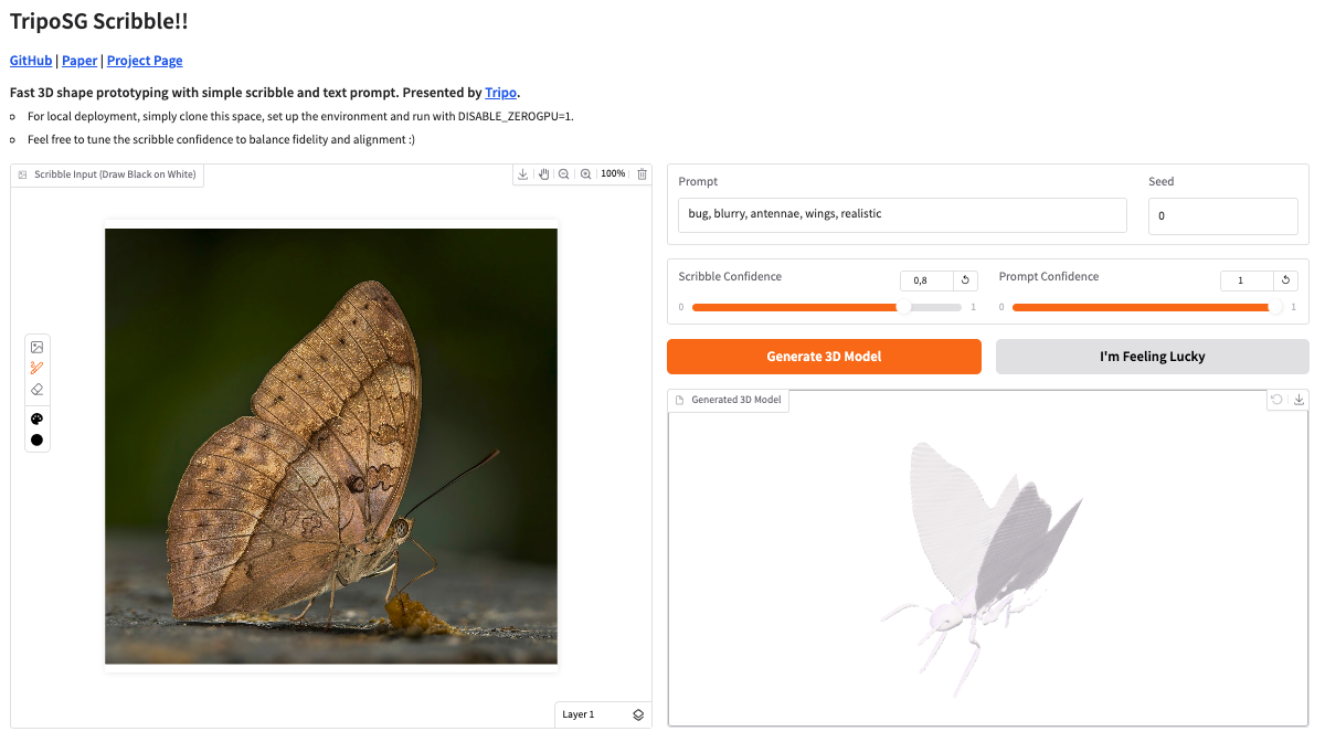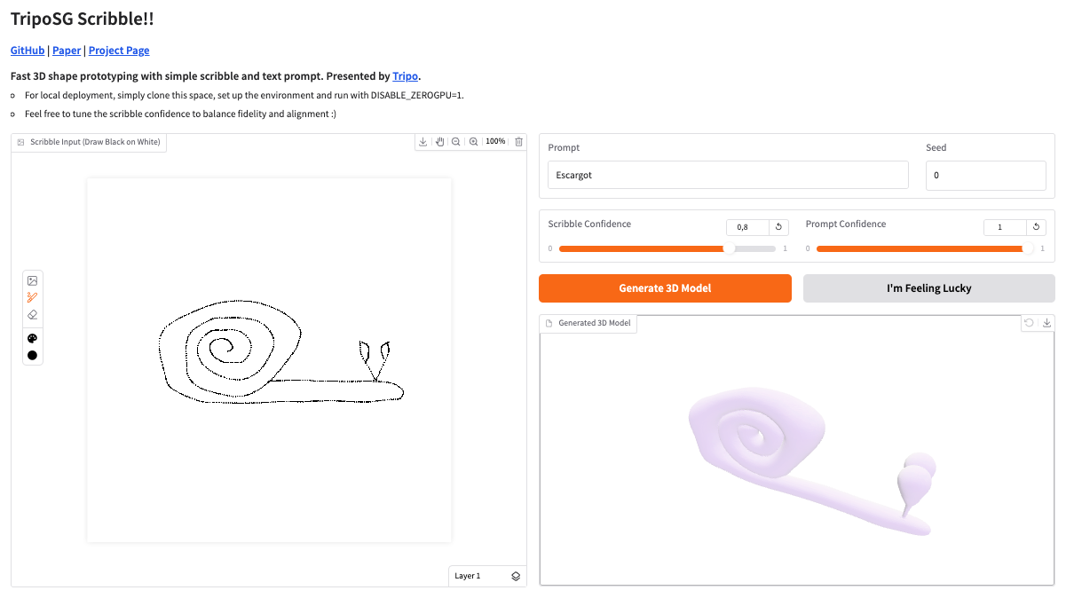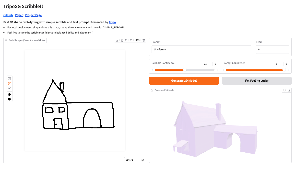 TripoSG-Scribble (Démonstration https://huggingface.co/spaces/VAST-AI/TripoSG-scribble et documentation : https://github.com/VAST-AI-Research/TripoSG) génère des images 3D à partir d’un dessin à main levée ou d’une photo et d’une instruction.