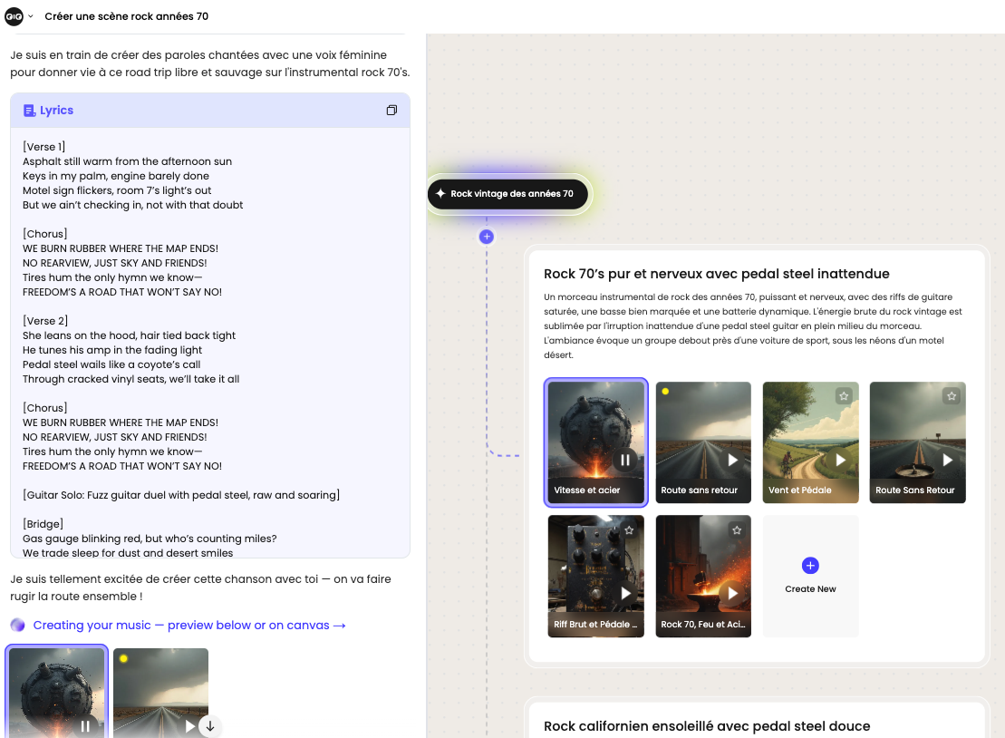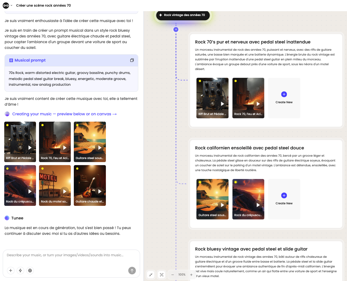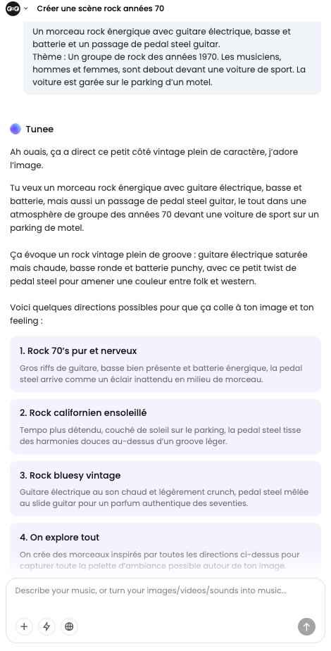 Tunee (https://www.tunee.ai) génère des morceaux de musique avec ou sans paroles à partir d’un chatbot multi-agents basés sur un modèle de langage avec raisonnement (non spécifié)