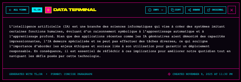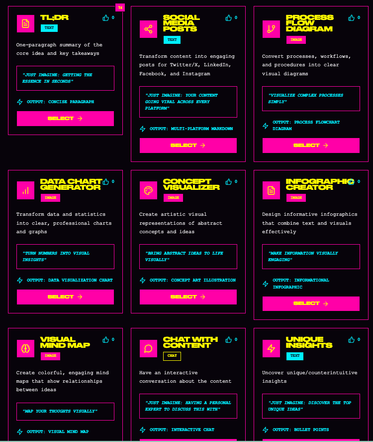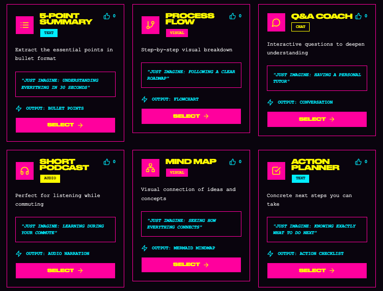 Unrav (https://unrav.io/) accompagne la compréhension et la communication de pages web et de vidéos youtube en générant 15 « interprétations » – les « lens » – différentes : réumé, infographie, podcasts (FR pris en charge mais avec voix anglaises), diagrammes, cartes mentales, chatbots, etc.