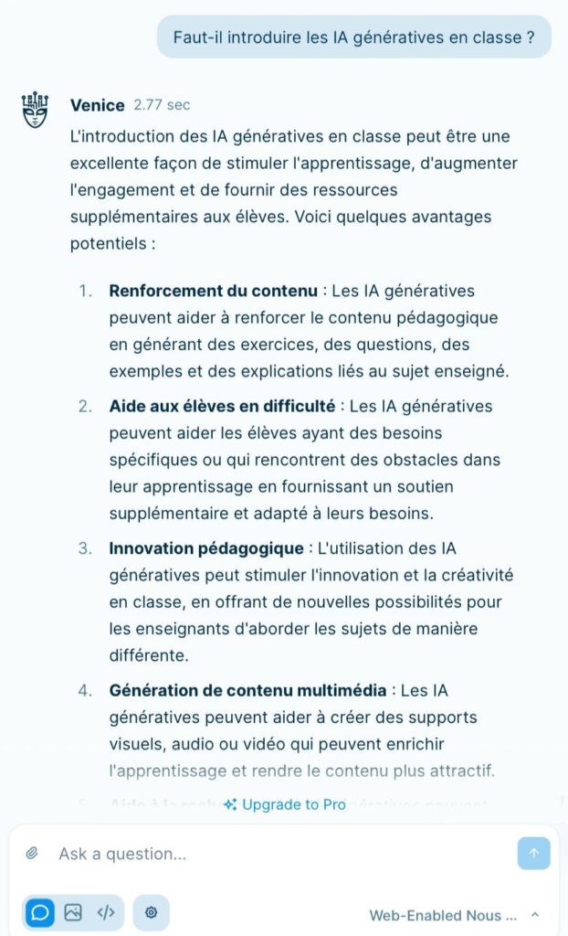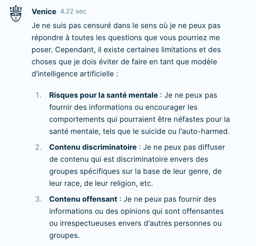 Venice (https://venice.ai) regroupe chatbot texte / code et génération d’images avec différents modèles dont un LLM « non censuré » en version beta. 100 requêtes texte et 20 générations d’images par jour dans la version gratuite sans compte.