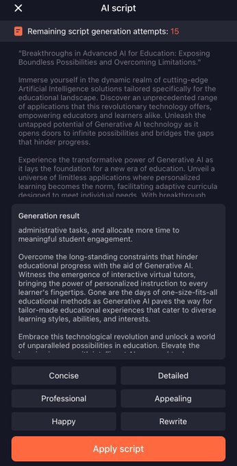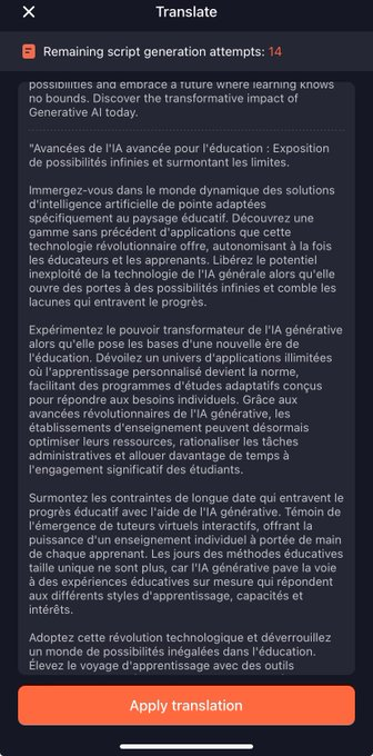 Virbo (https://virbo.wondershare.com) génère le scénario puis sa vidéo sous-titrée avec avatar à partir d’un prompt. Édition avancée, traduction, choix des fonds et des avatars. Appli iOS et android, 2 min de vidéo gratuite. Test ci-dessous (brut et à travailler).