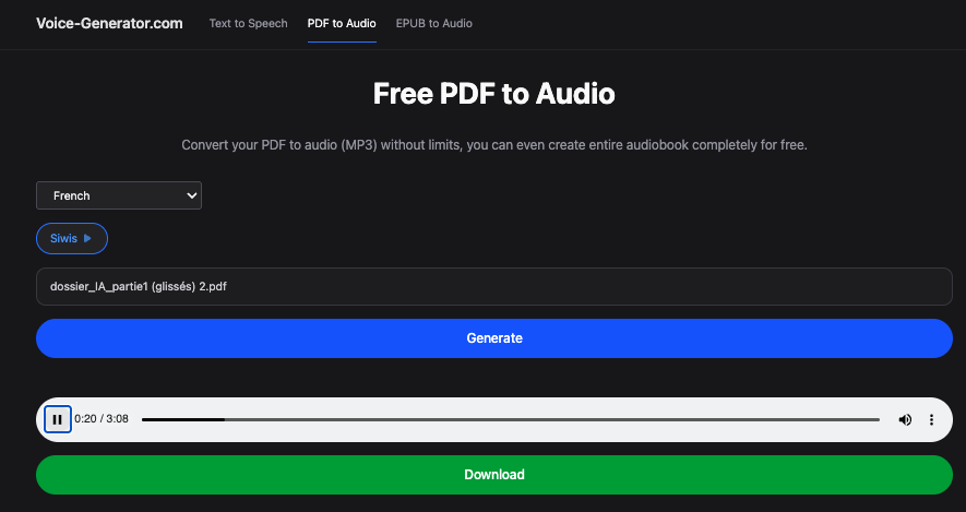 Voice generator (https://voice-generator.com/) transforme des textes en voix à partir de texte écrit ou collé, pdf ou epub.