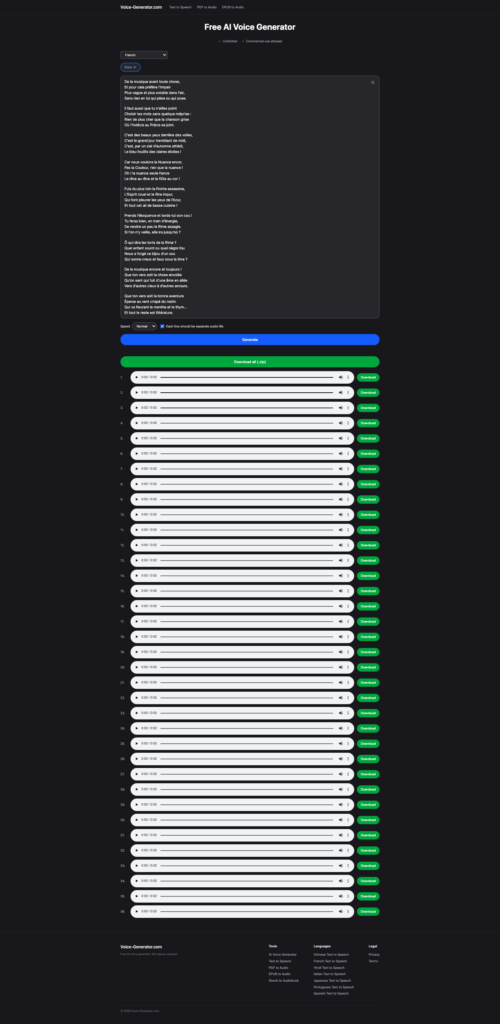 Dans la partie texte vers voix, une option permet de générer un fichier audio par ligne de texte avec export individuel ou zip.