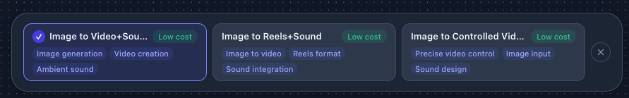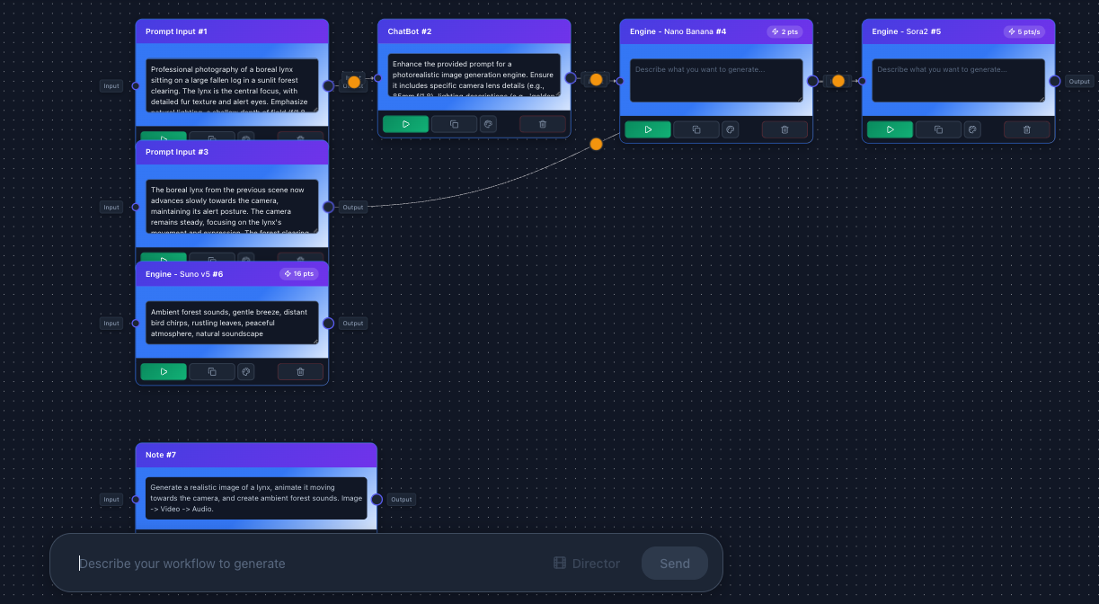 VoooAI (https://voooai.com/) génère des images, vidéos et morceaux de musique à partir d’un flux de production (« workflow ») : une instruction génère un contenu qui devient source d’une autre instruction etc.
