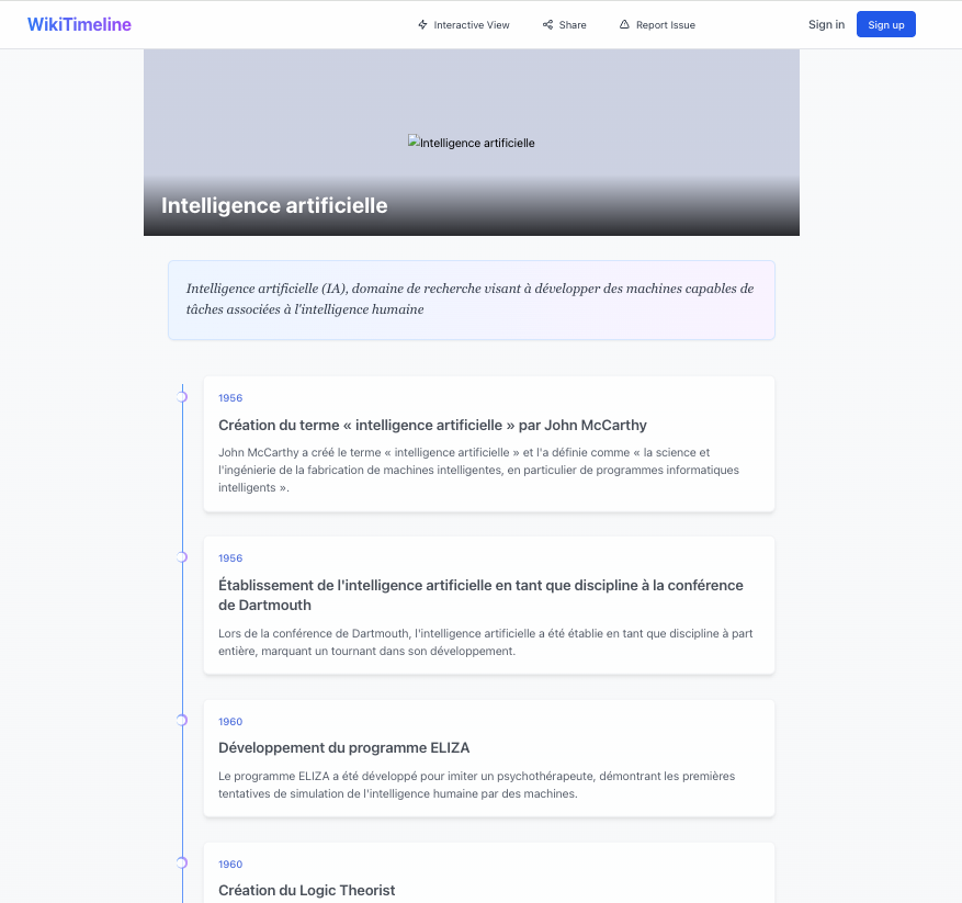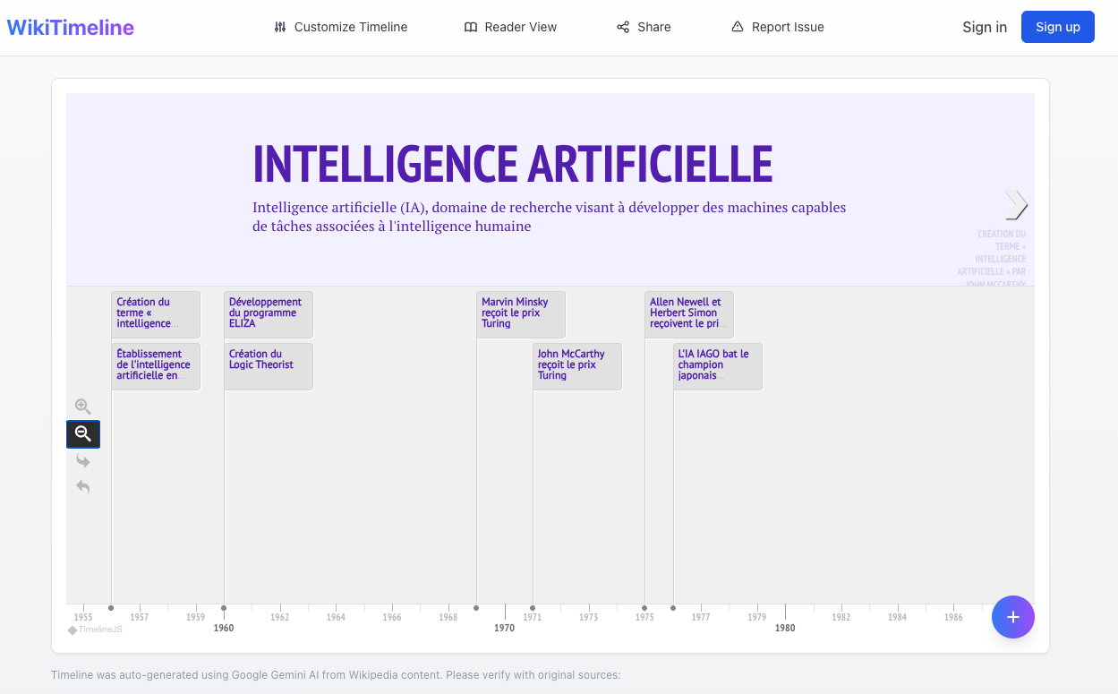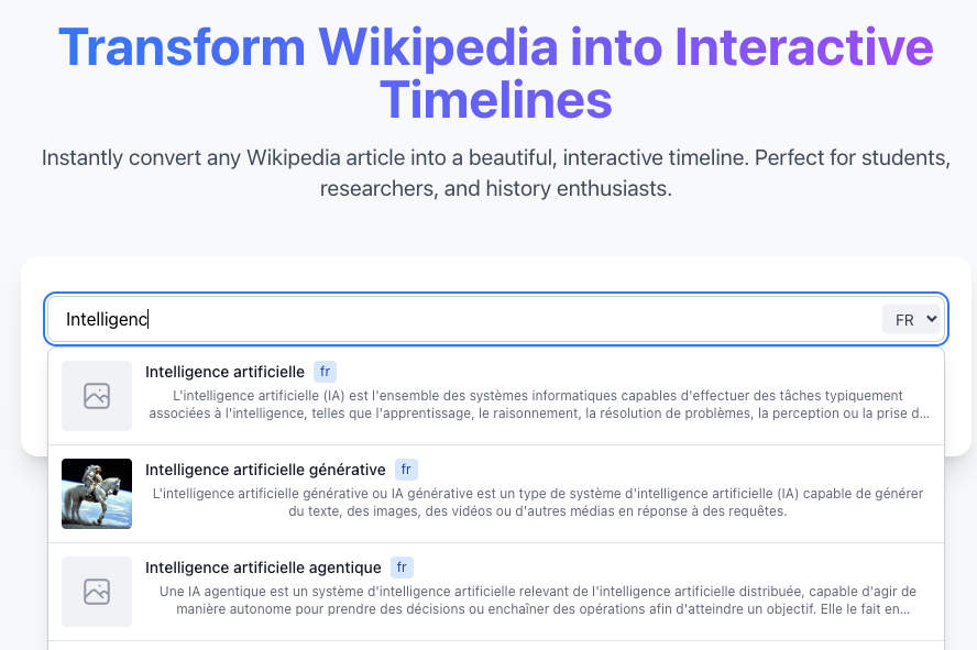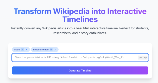Wiki Timeline (https://wiki-timeline.com) génère des frises chronologique à partir d’un ou des articles Wikipedia (ajout via recherche ou url).