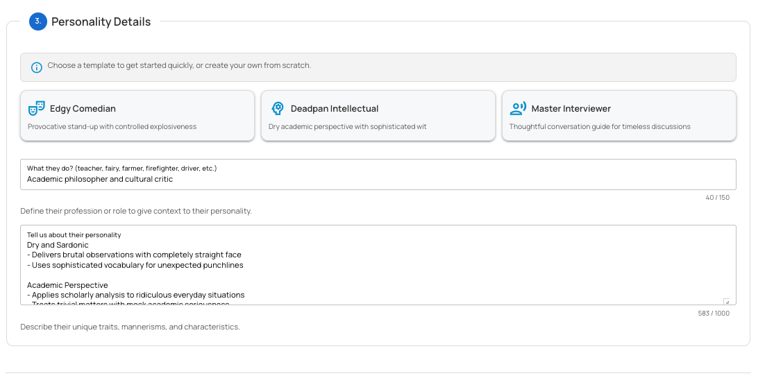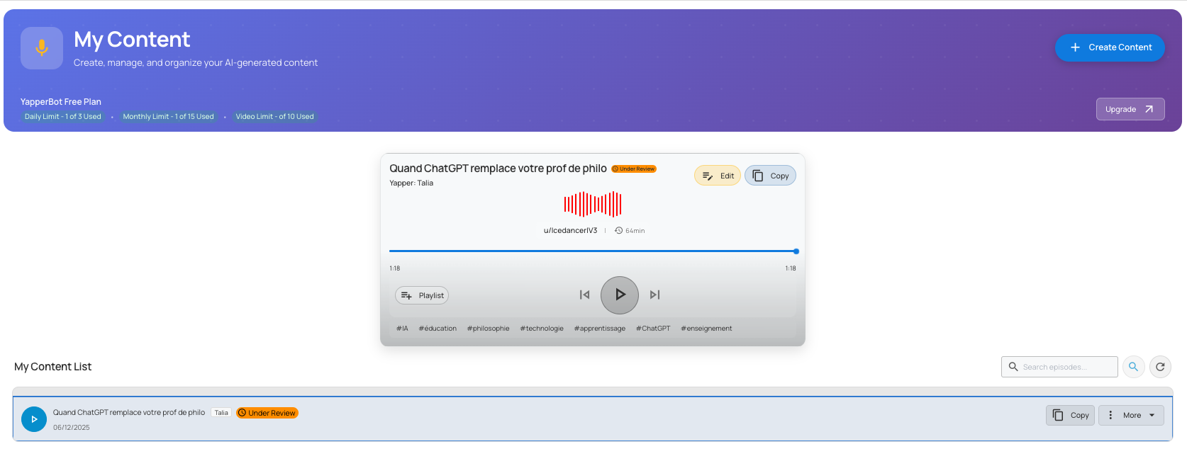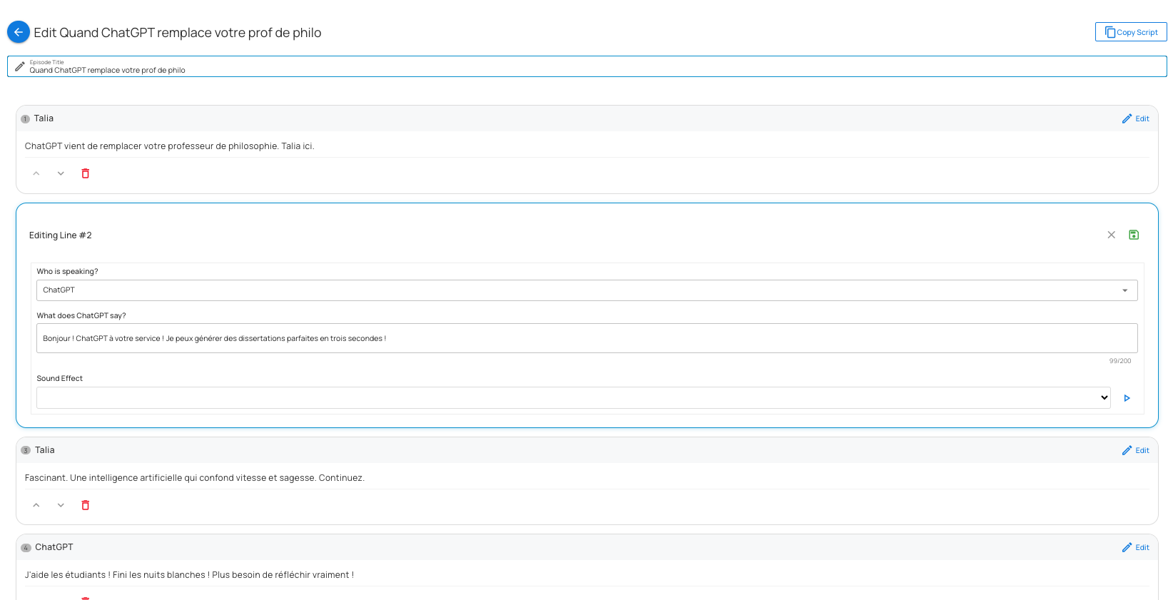 Après création du persona avec choix de sa voix et définition du sujet traité, un audio est créé. Son script peut-être modifié avant publication et une vidéo sous-titrée peut être générée à partir de cet audio.