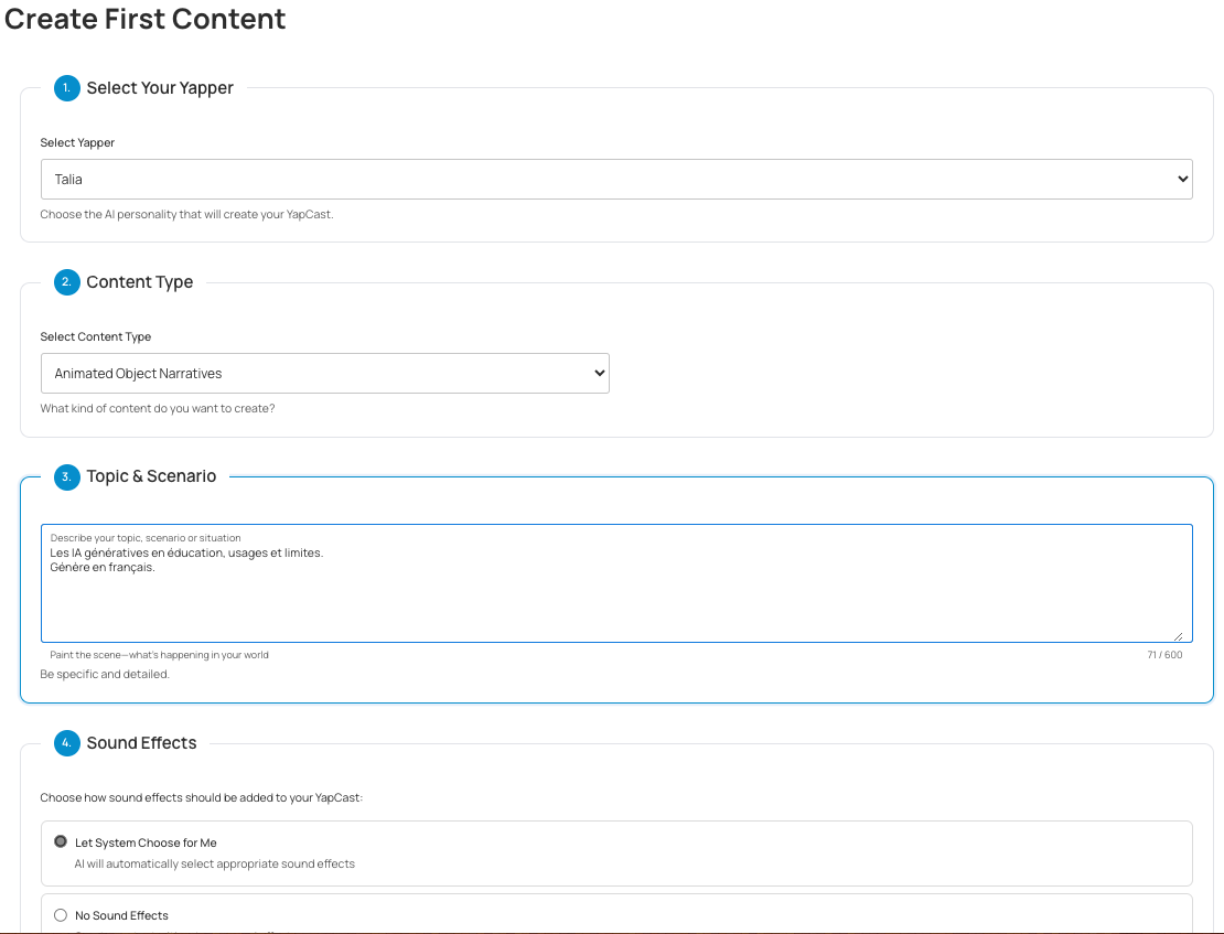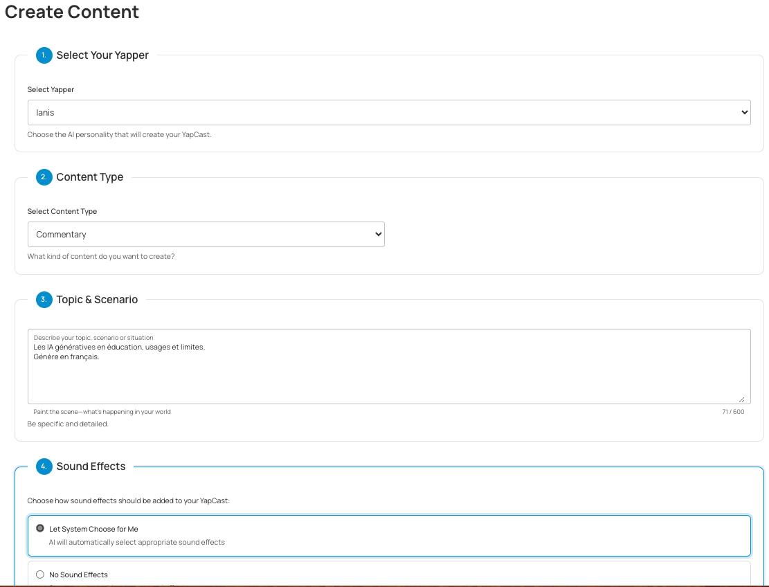YapperBot (https://www.yapperbot.com/) génère des audios et des vidéos à partir d’un persona et d’une instruction.
